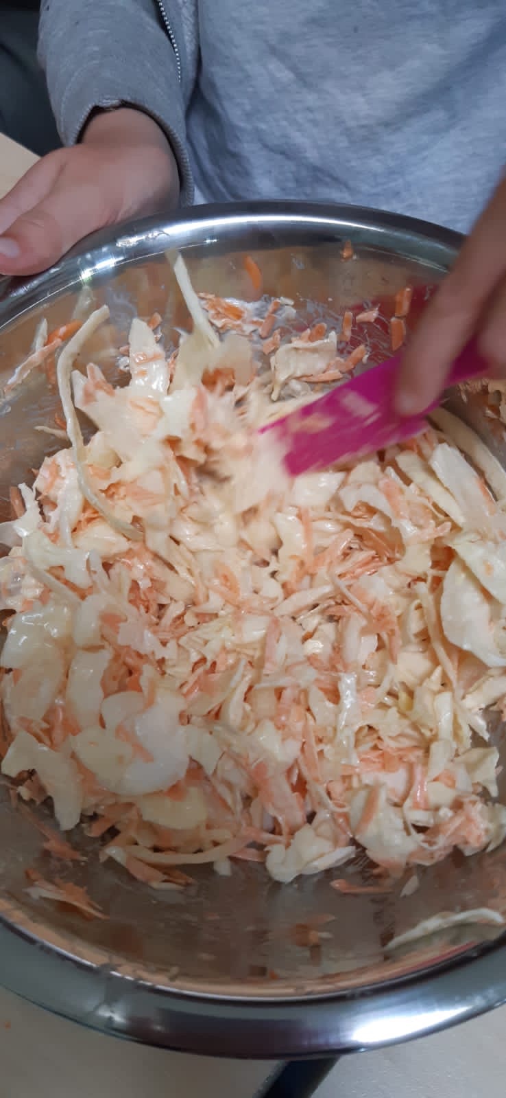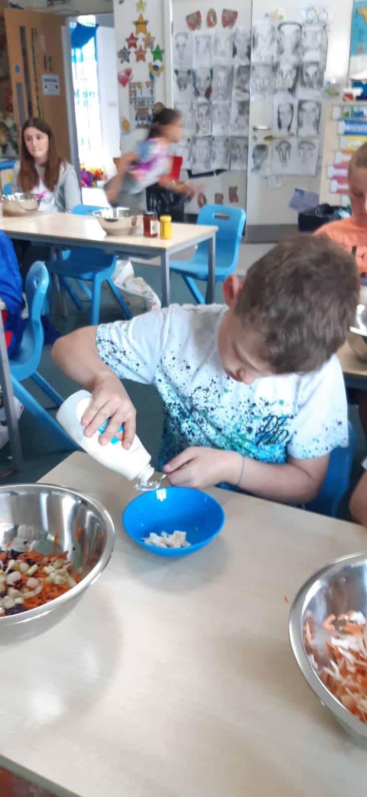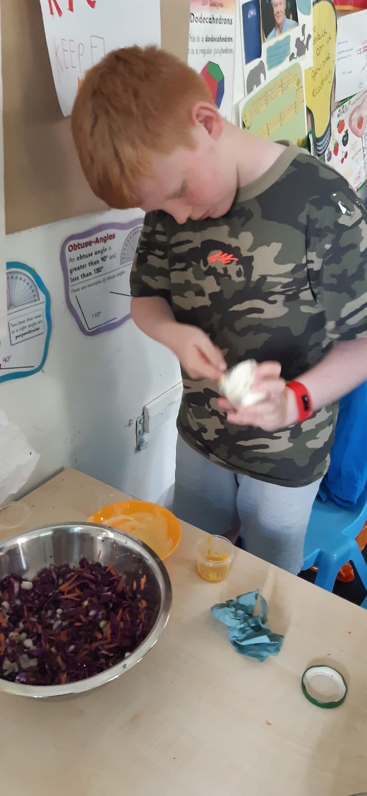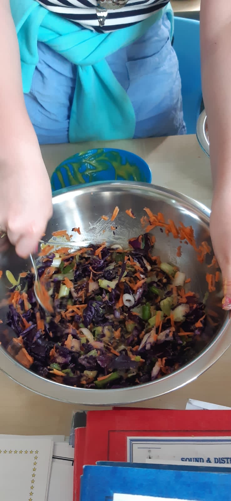 Yesterday Onyx class used their peeling, chopping, slicing, mixing & grating skills to make their very own yummy coleslaw. š