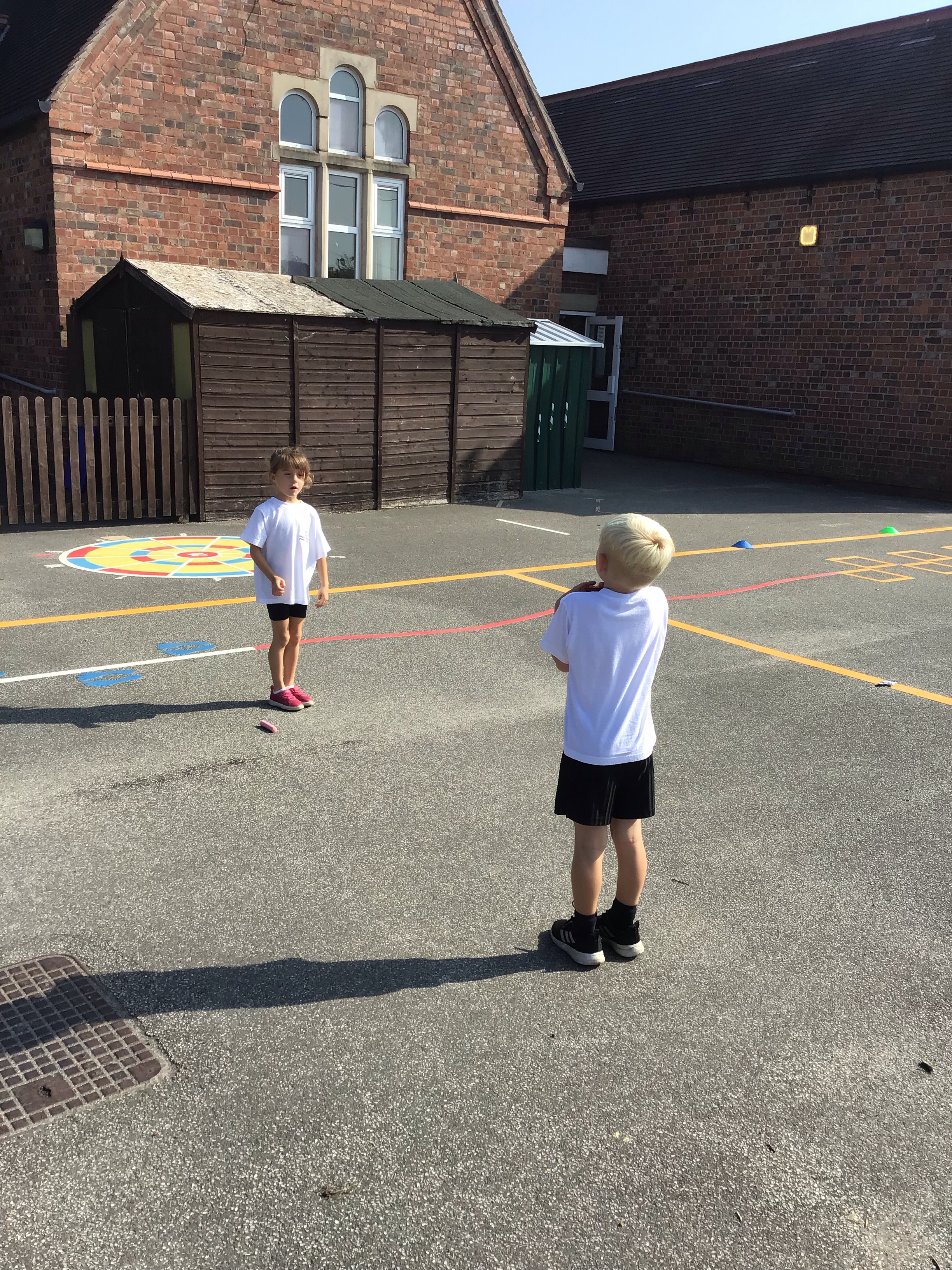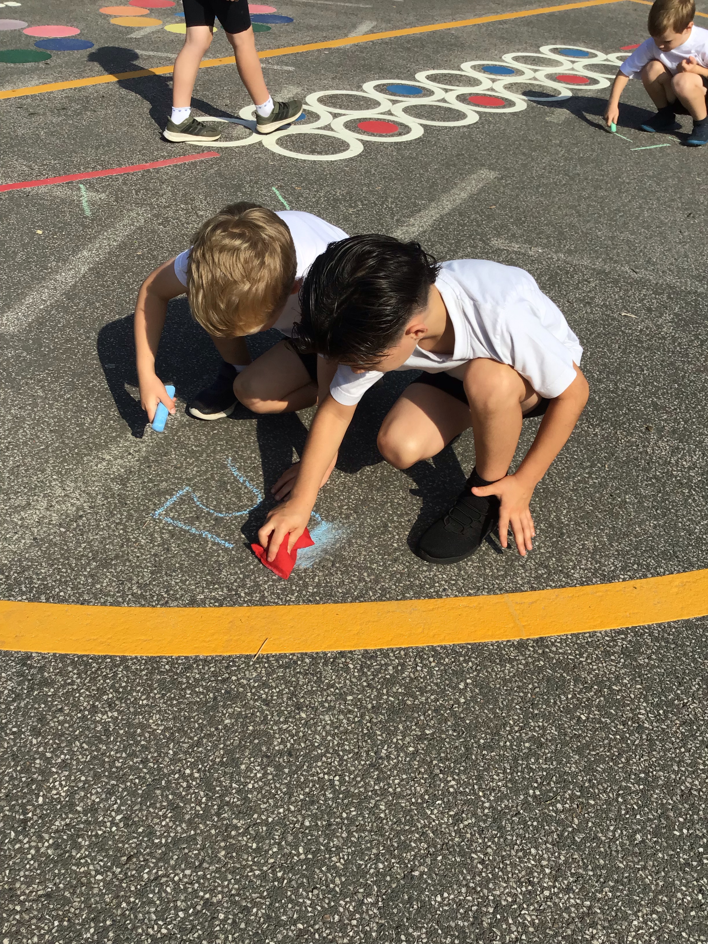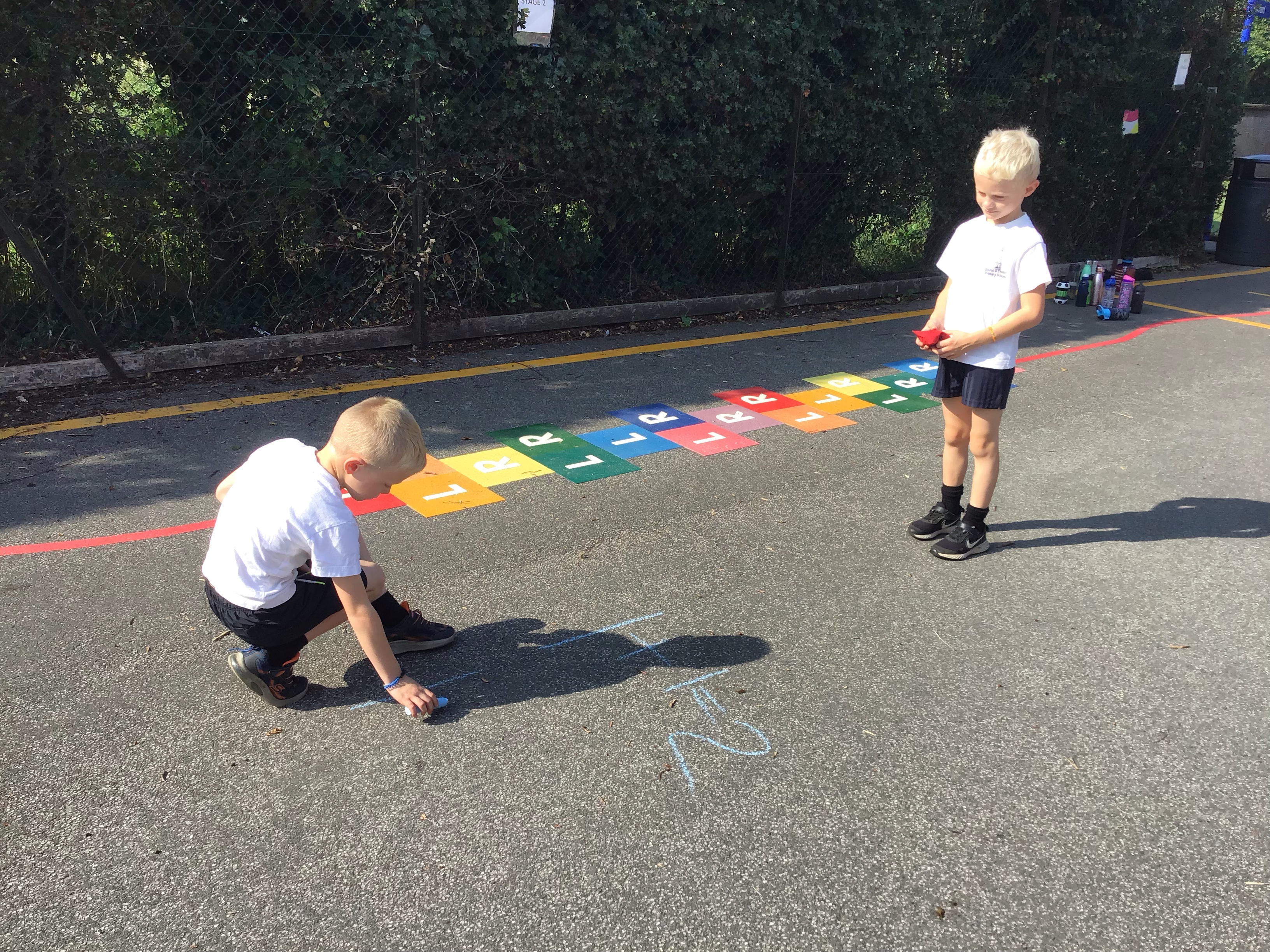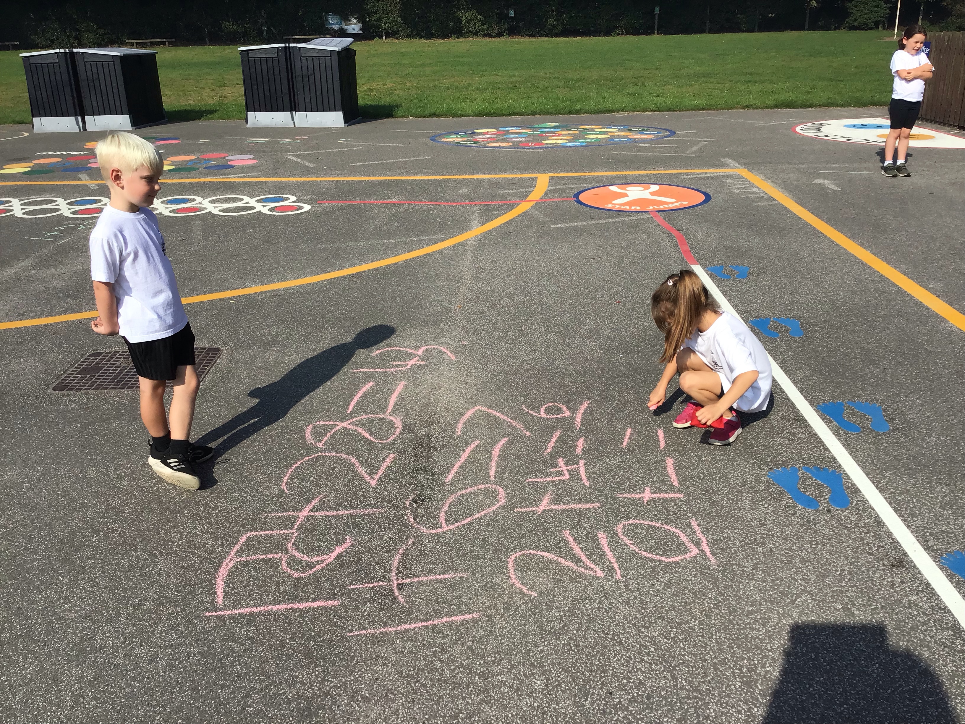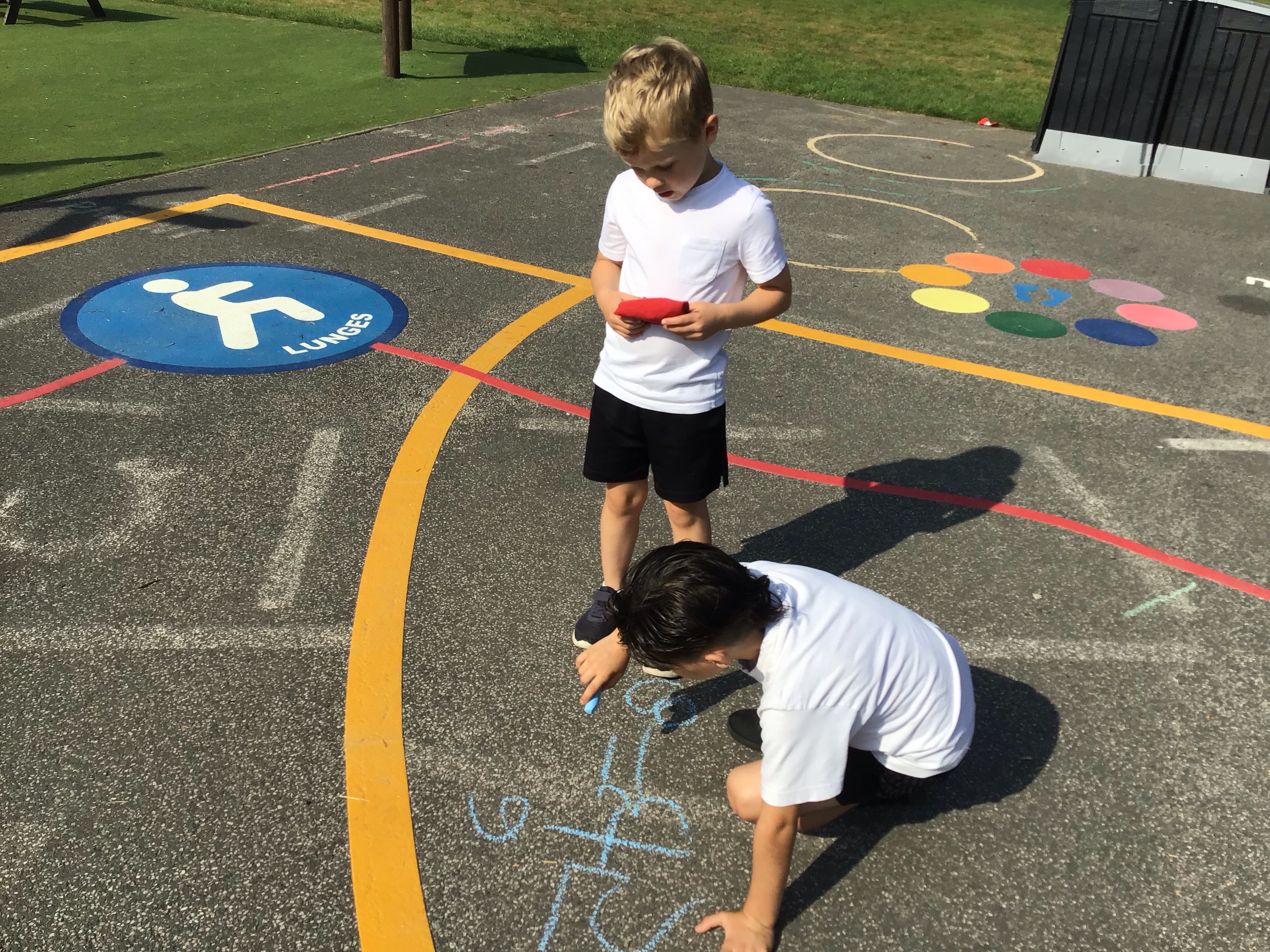 Our mission was to collect numbers with our partner and solve addition sums together! We used chalk and bean bags to complete our Maths mission!