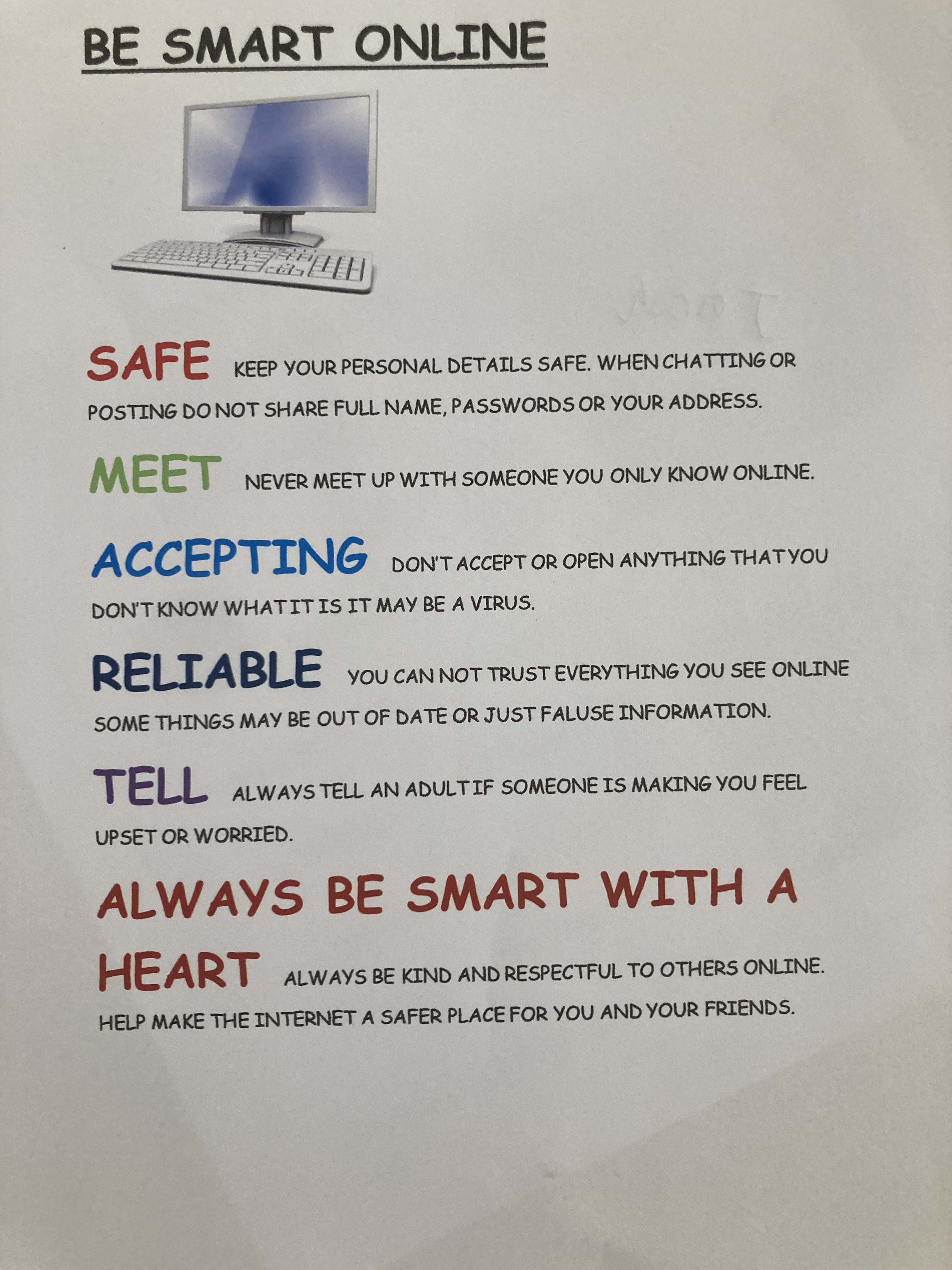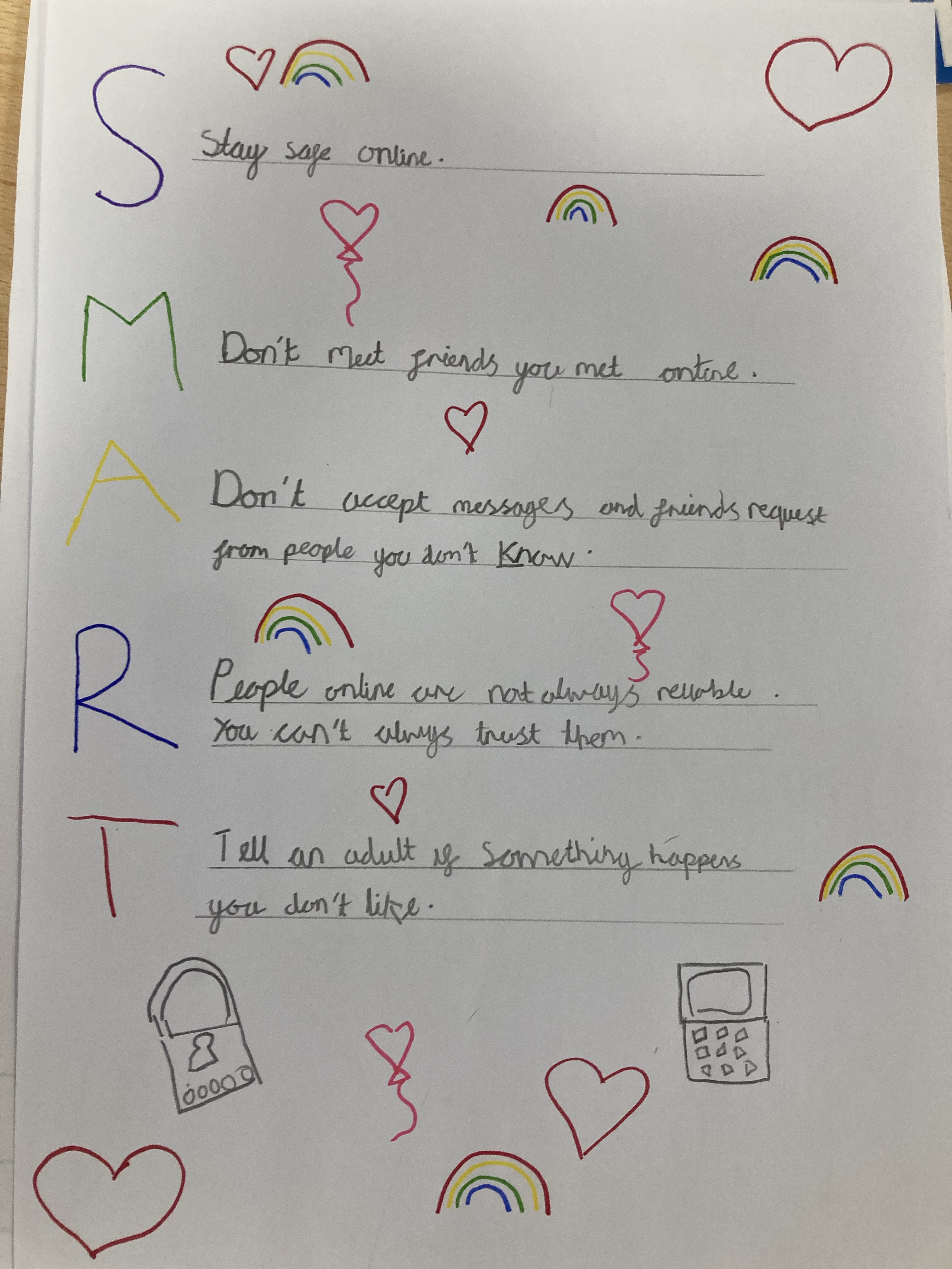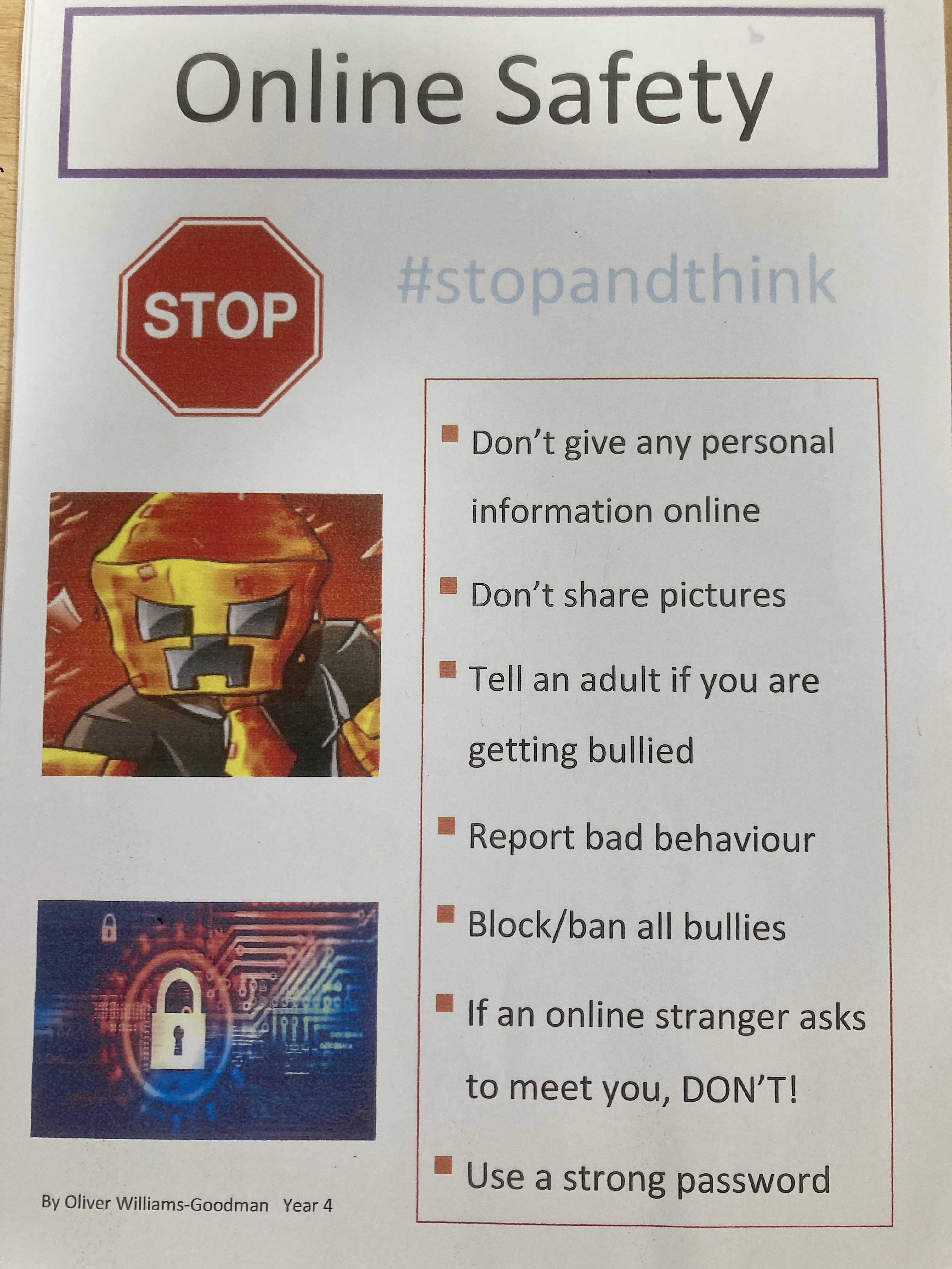 Over the past few weeks, we have been thinking about how to be safe online. The children collated all their learning and created fantastic posters to share the message and remind us all how to stay safe online. These are now displayed around the school and classroom.