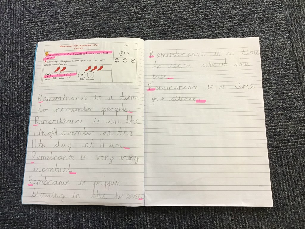 On Tuesday, the children created some fantastic remembrance list poems. I was blown away with the children’s ideas and the quality of their work.