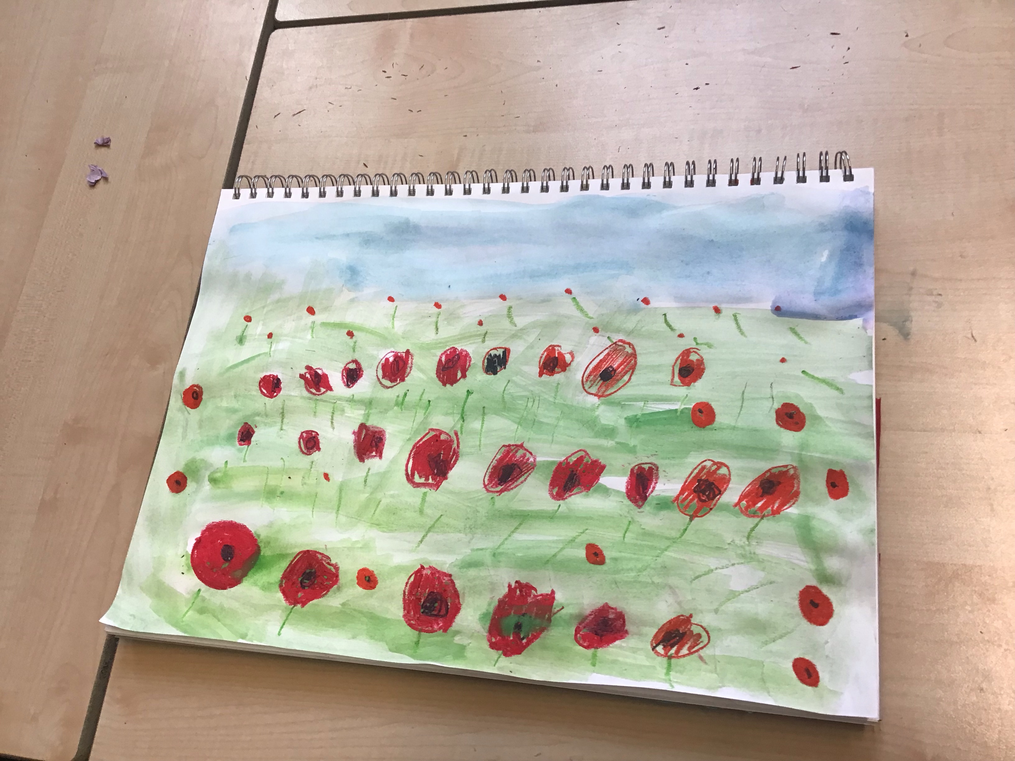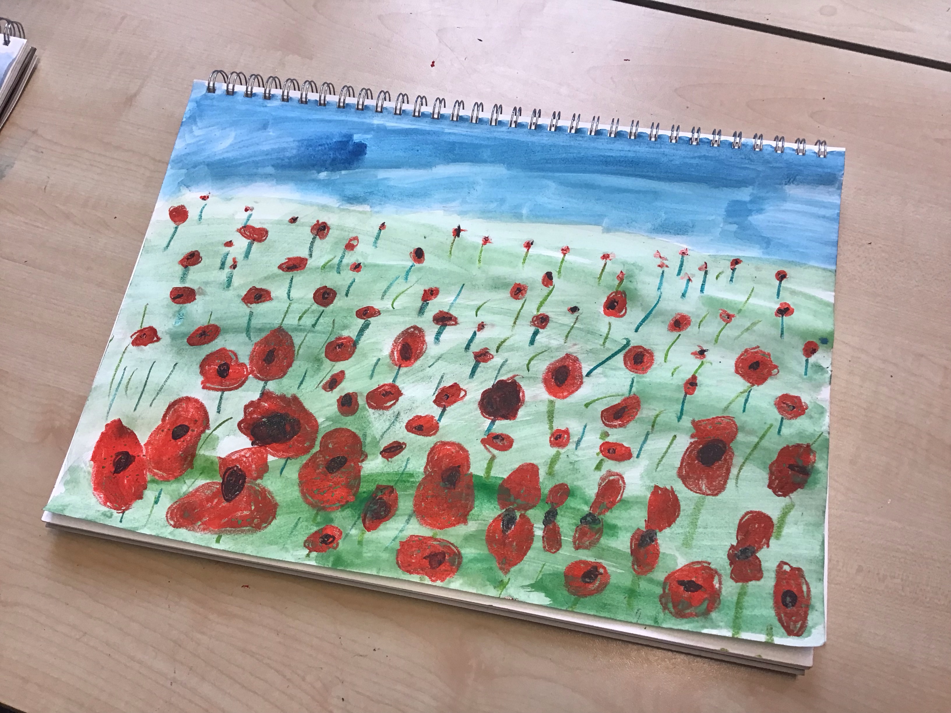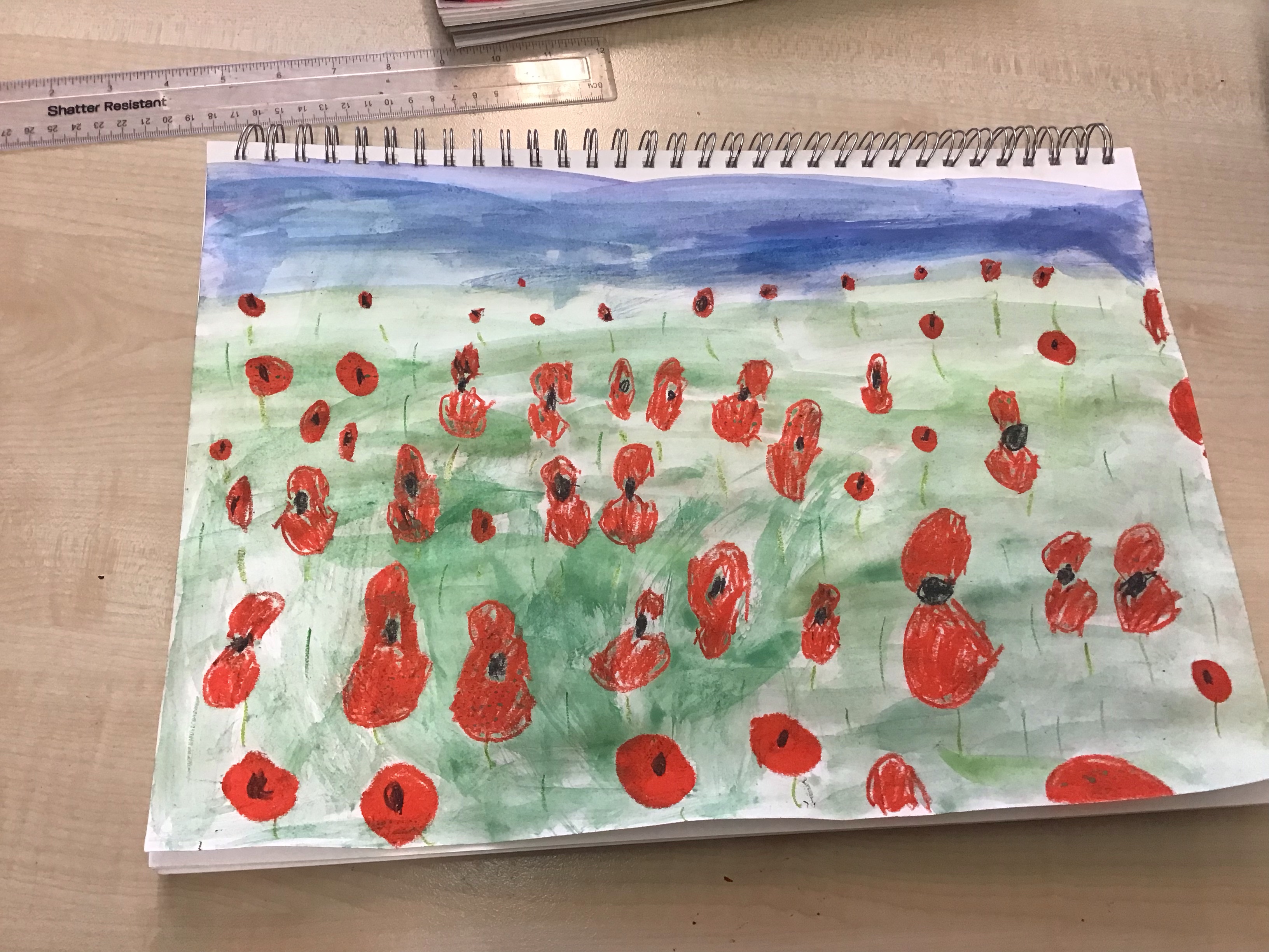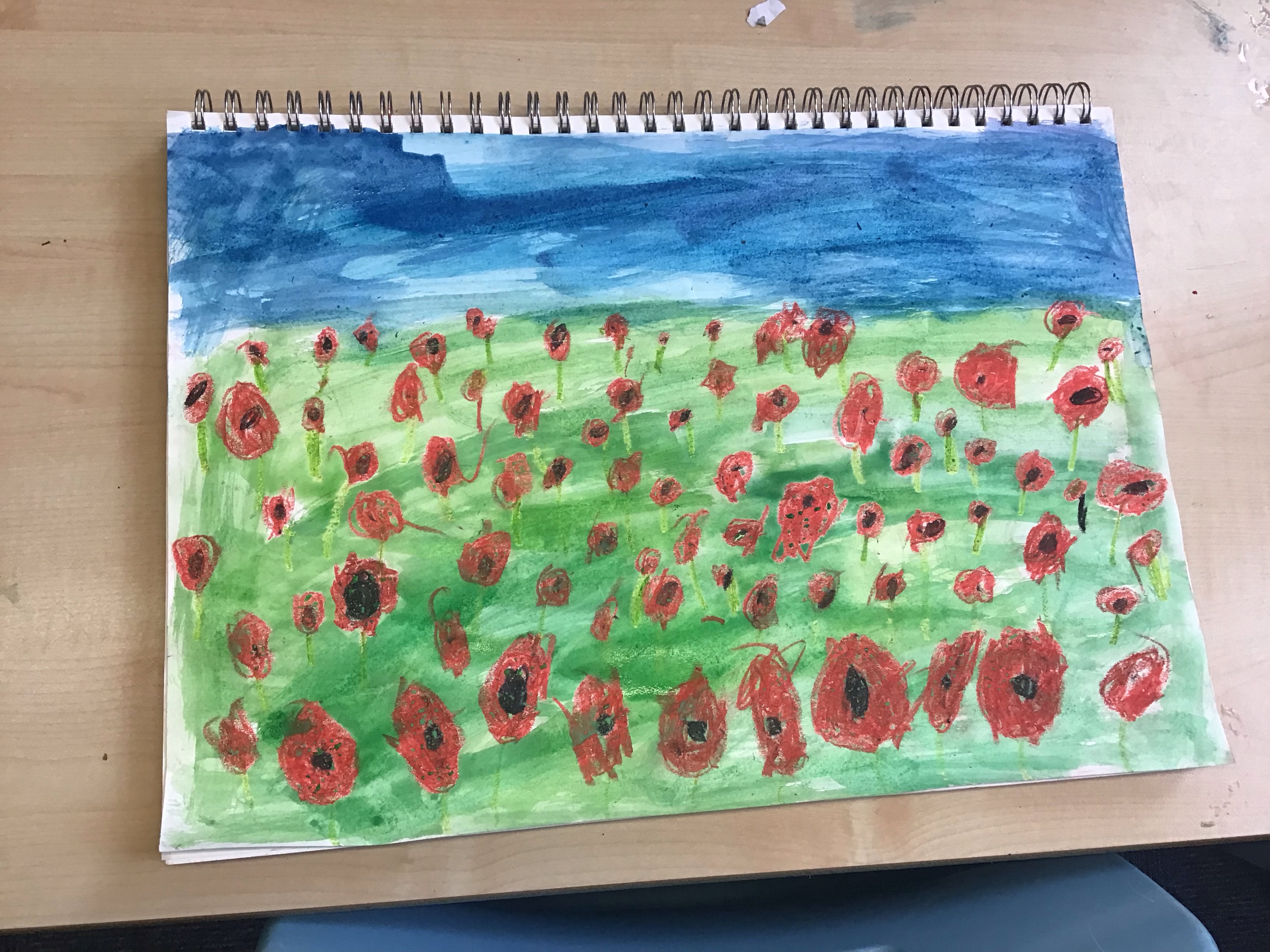To finish off the week, we enjoyed creating our own landscape pieces of art based on what we think Flanders field would look like when poppies grow each year. We used oil pastels and water colours to create our wonderful masterpieces. We talked about making sure the poppies in the foreground were larger than those in the middle and background.