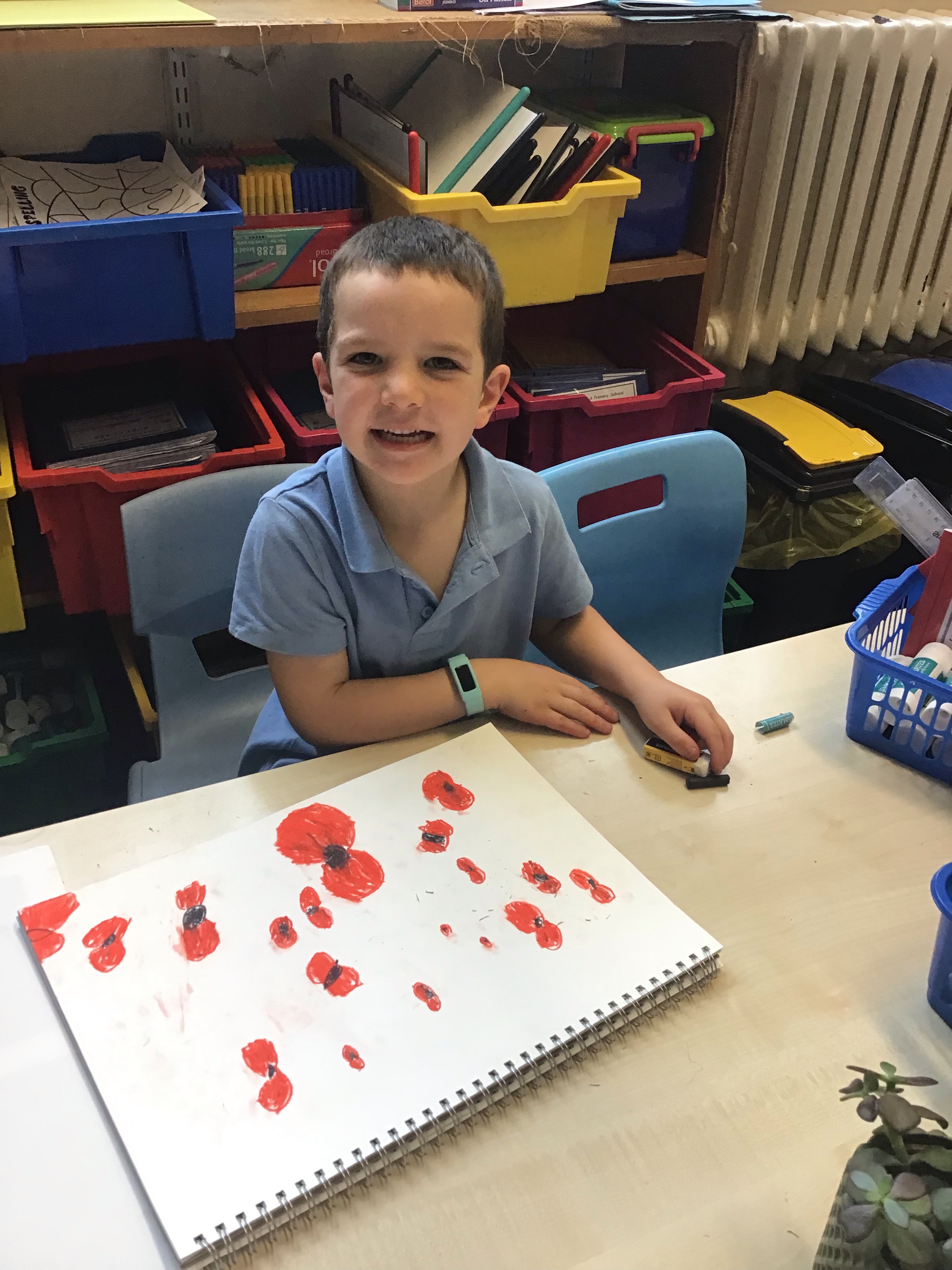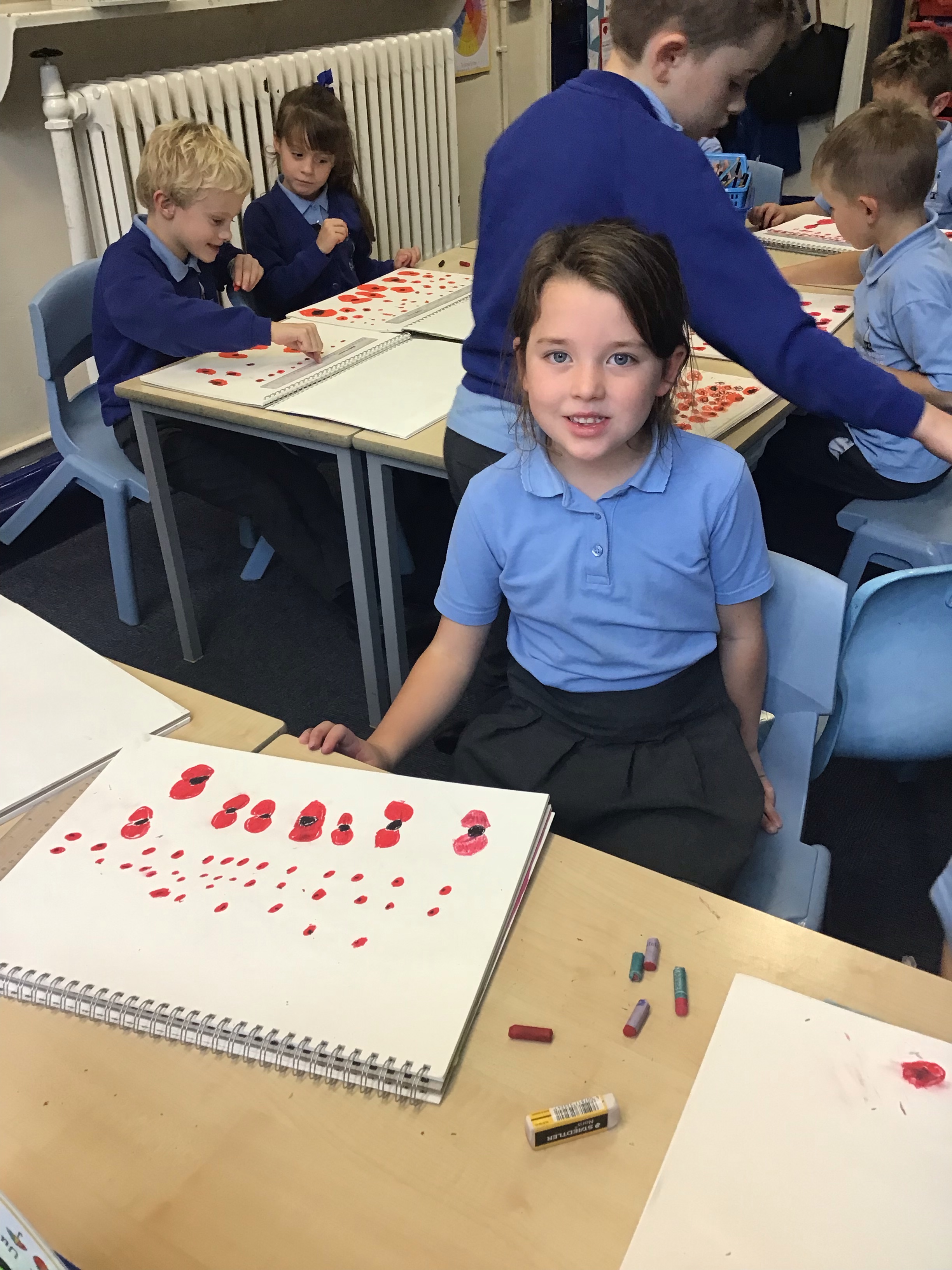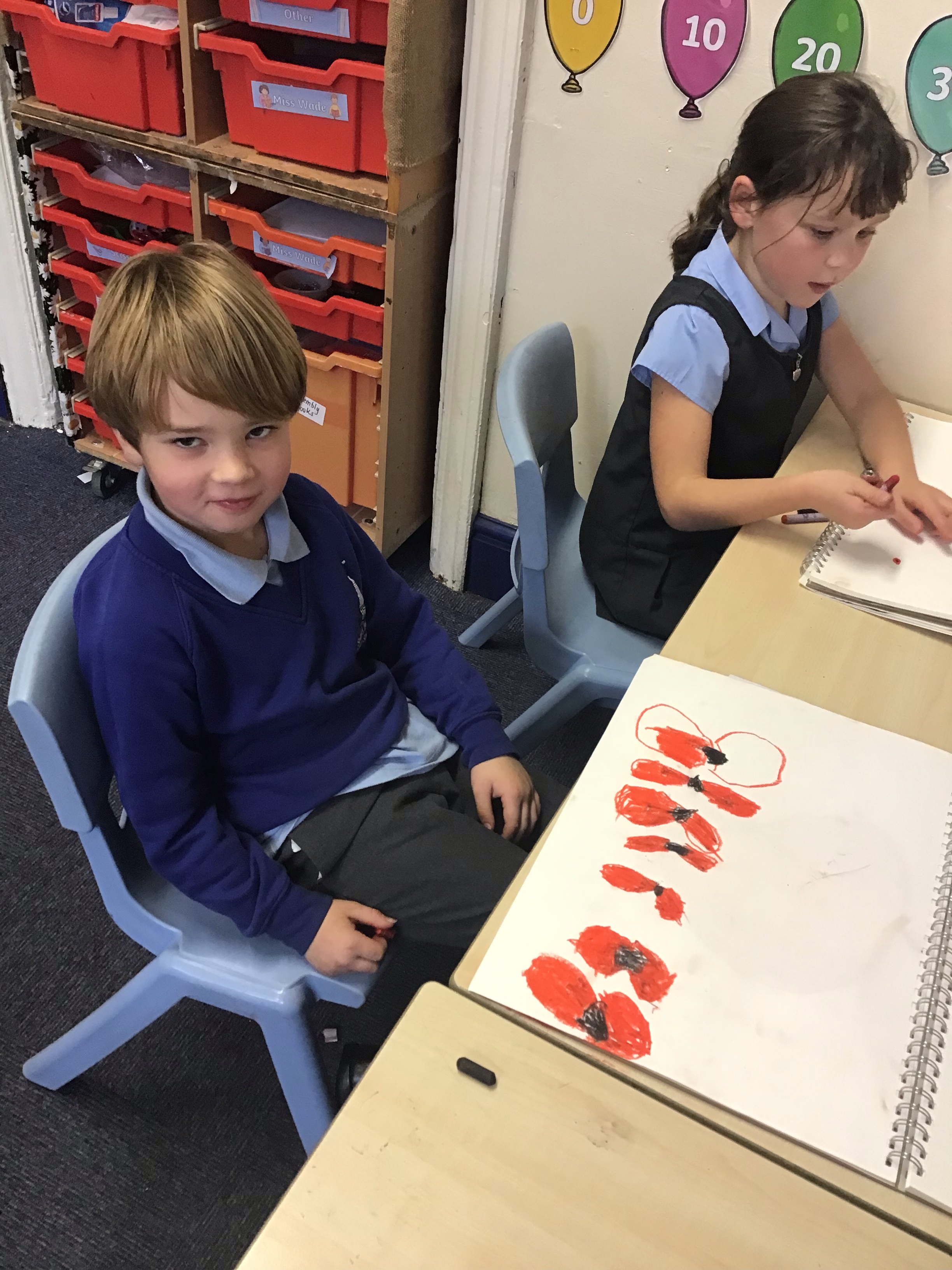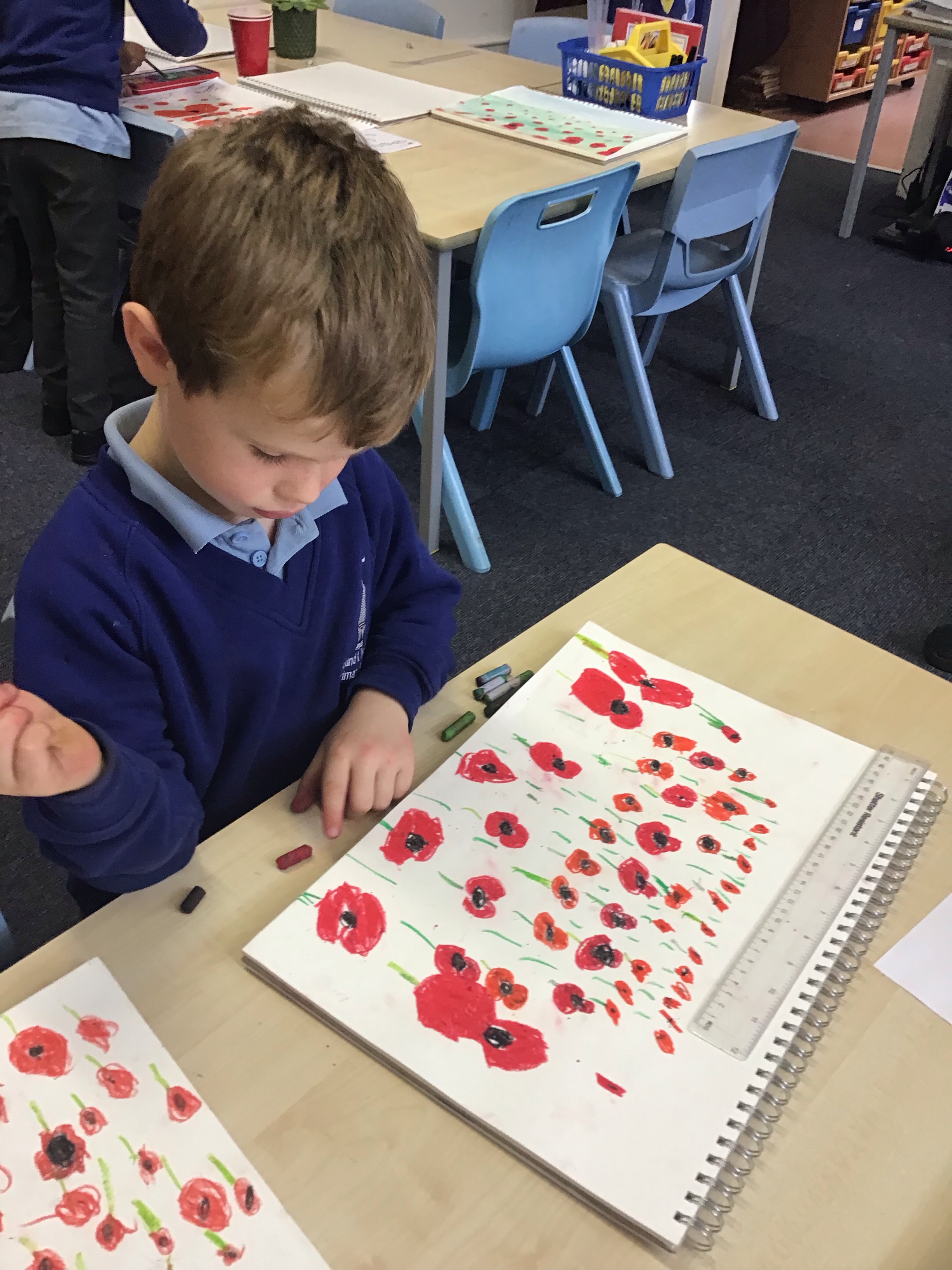 To finish off the week, we enjoyed creating our own landscape pieces of art based on what we think Flanders field would look like when poppies grow each year. We used oil pastels and water colours to create our wonderful masterpieces. We talked about making sure the poppies in the foreground were larger than those in the middle and background.