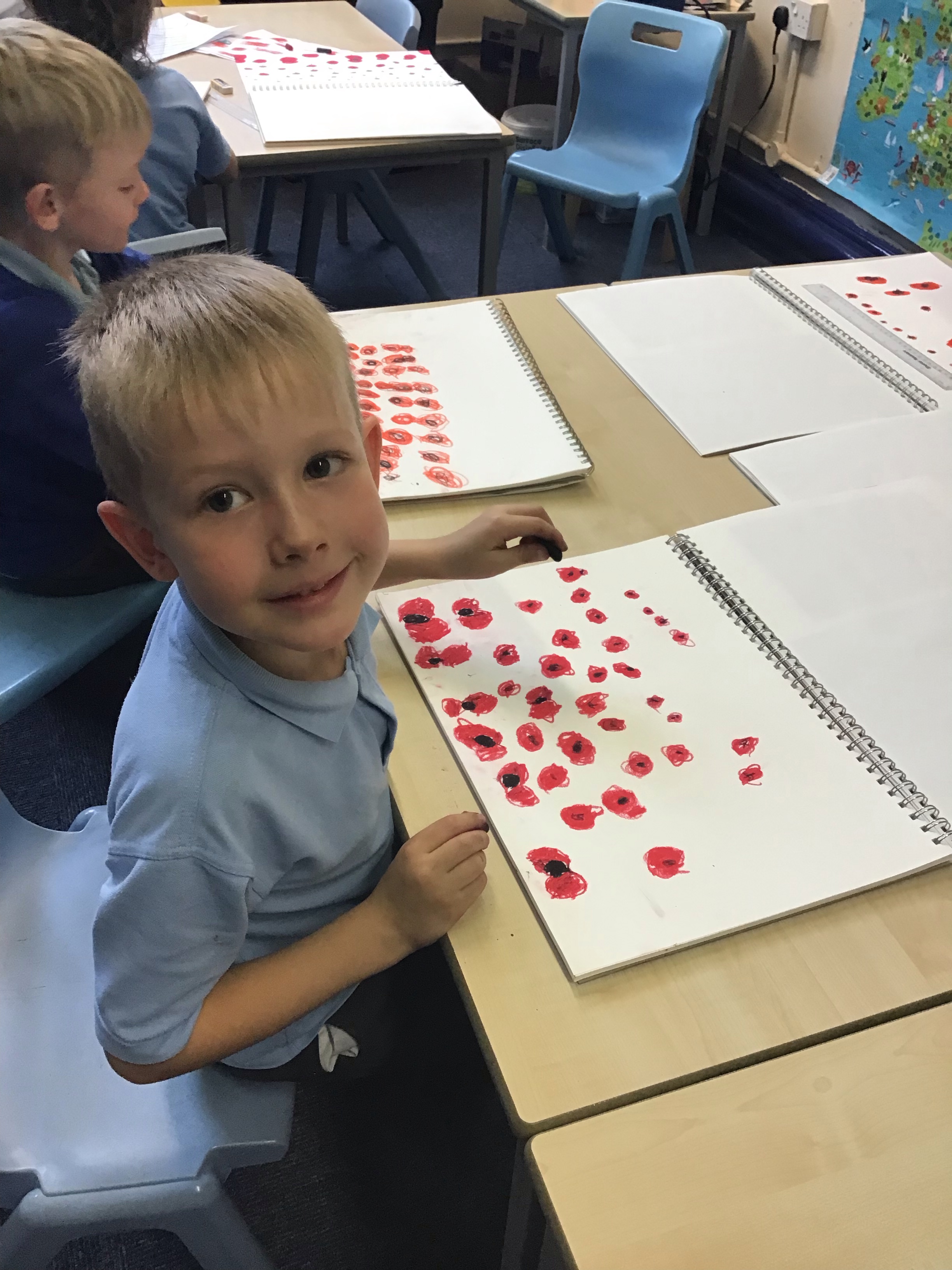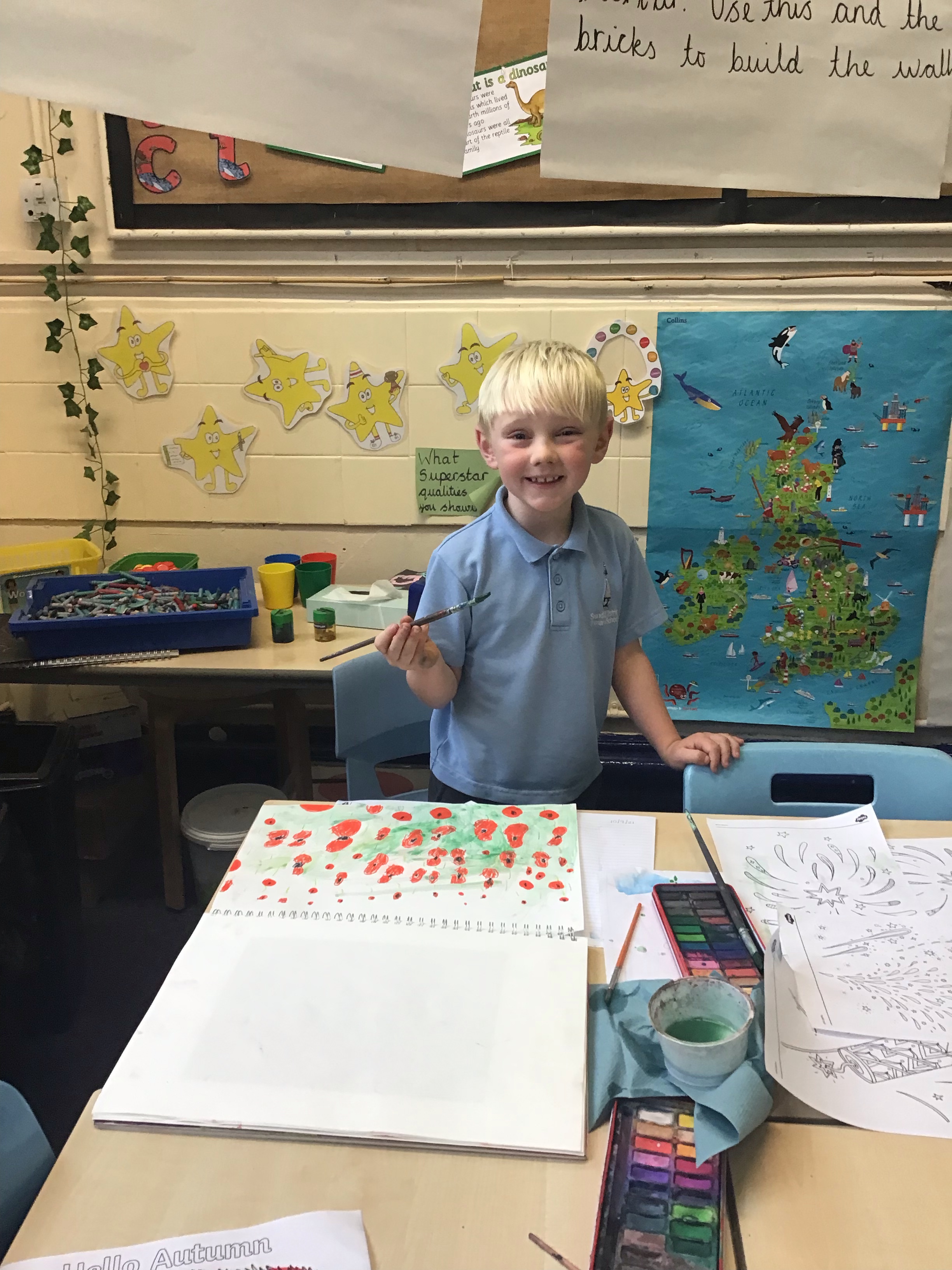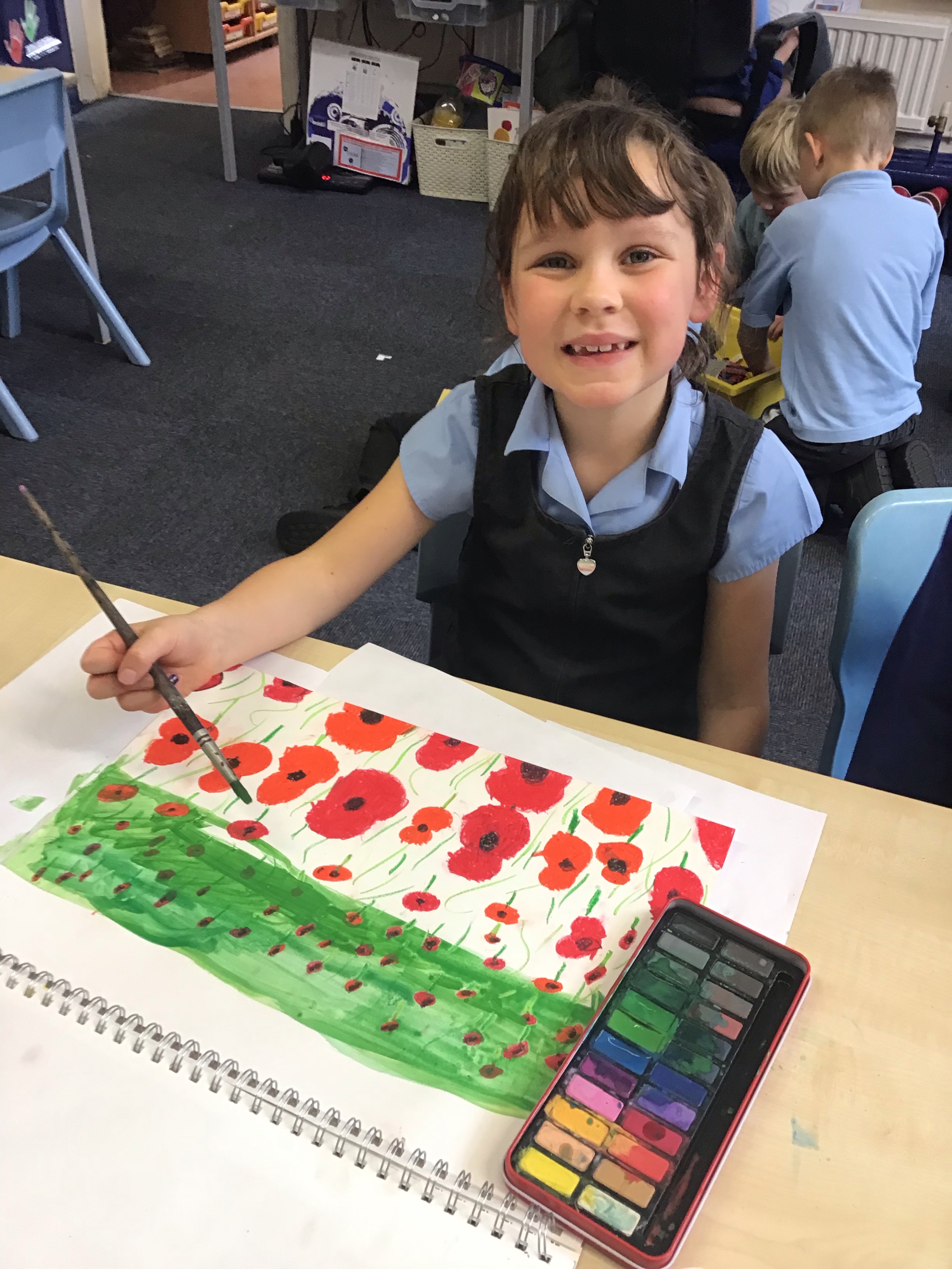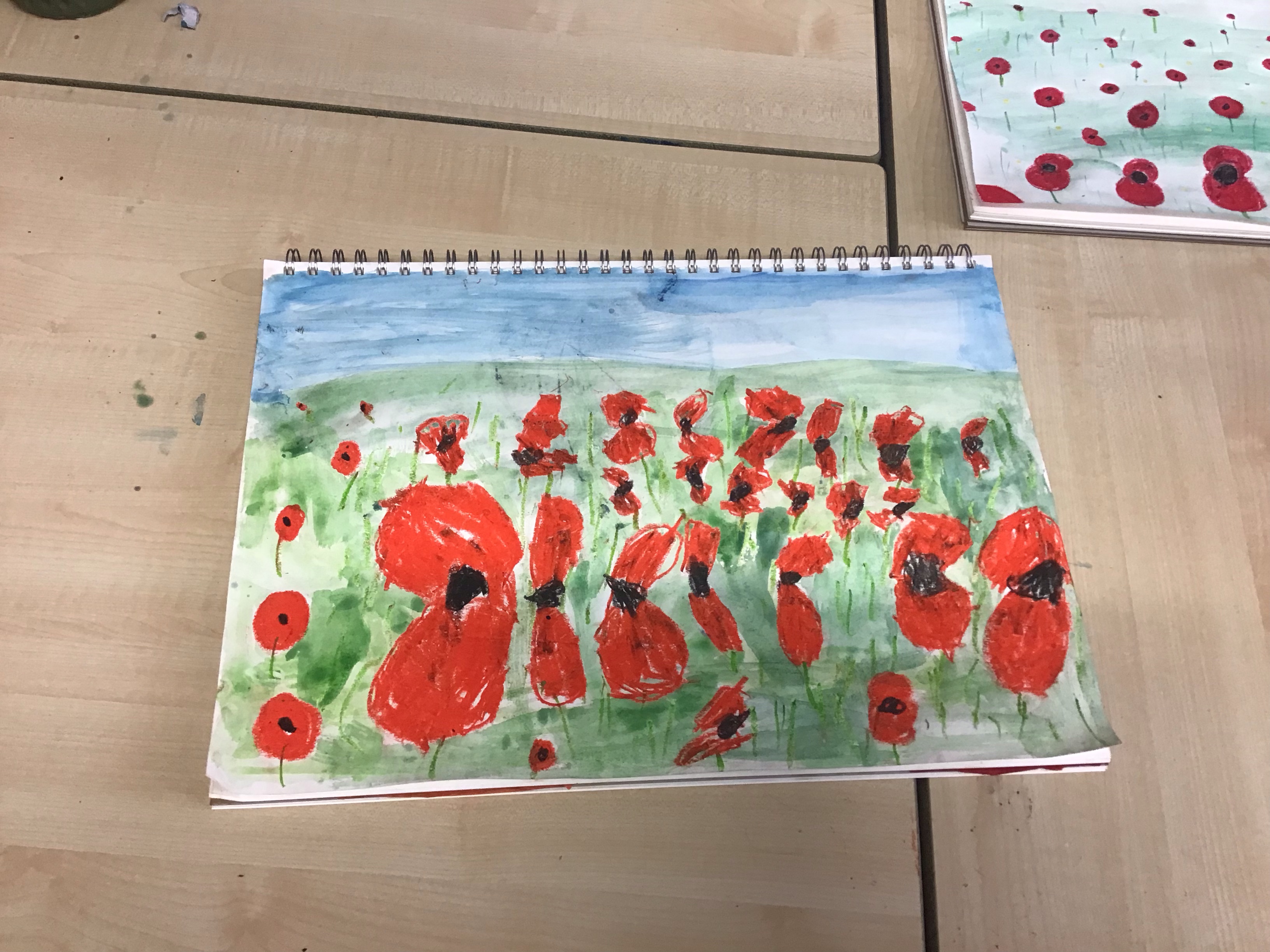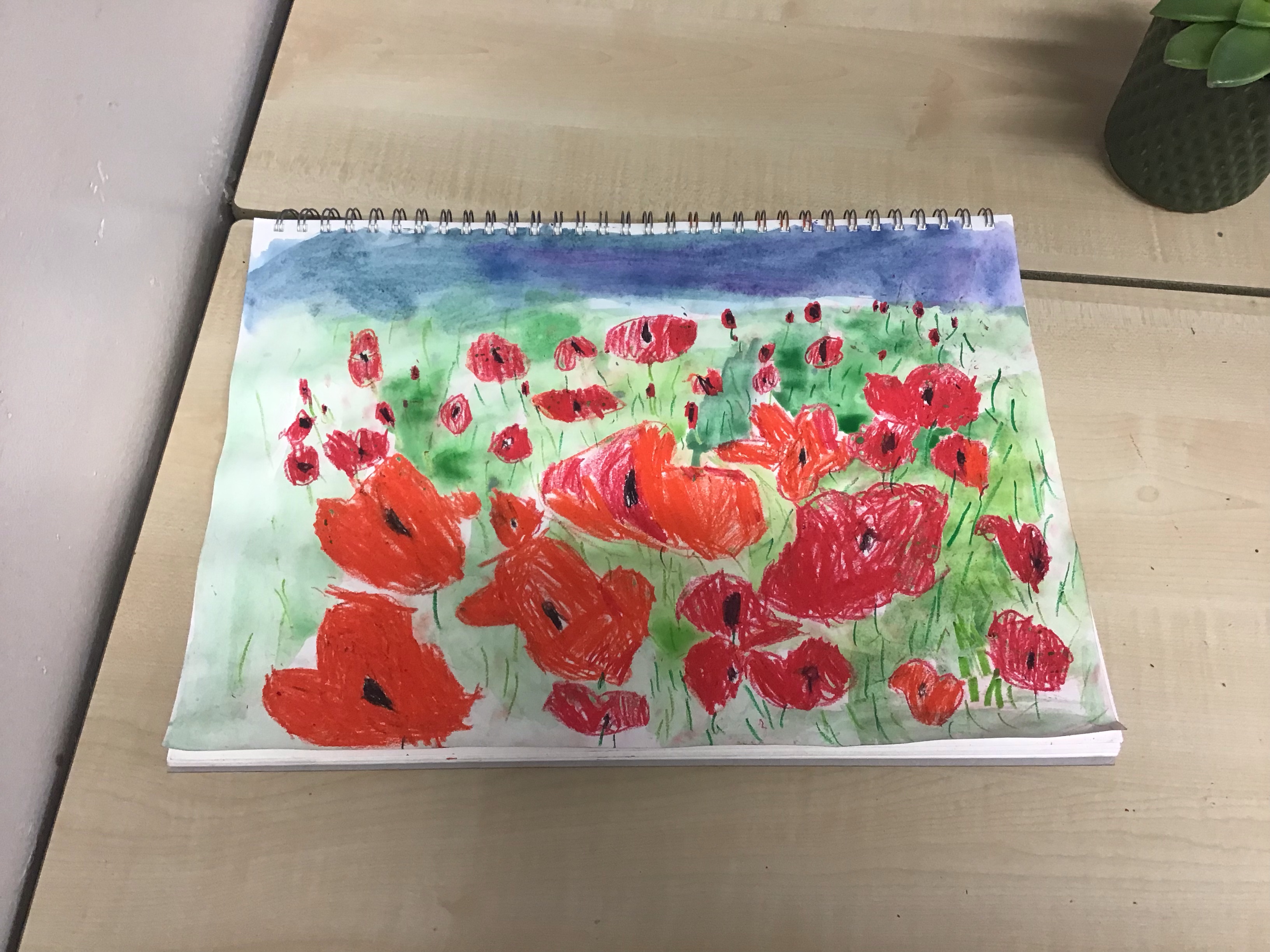 To finish off the week, we enjoyed creating our own landscape pieces of art based on what we think Flanders field would look like when poppies grow each year. We used oil pastels and water colours to create our wonderful masterpieces. We talked about making sure the poppies in the foreground were larger than those in the middle and background.