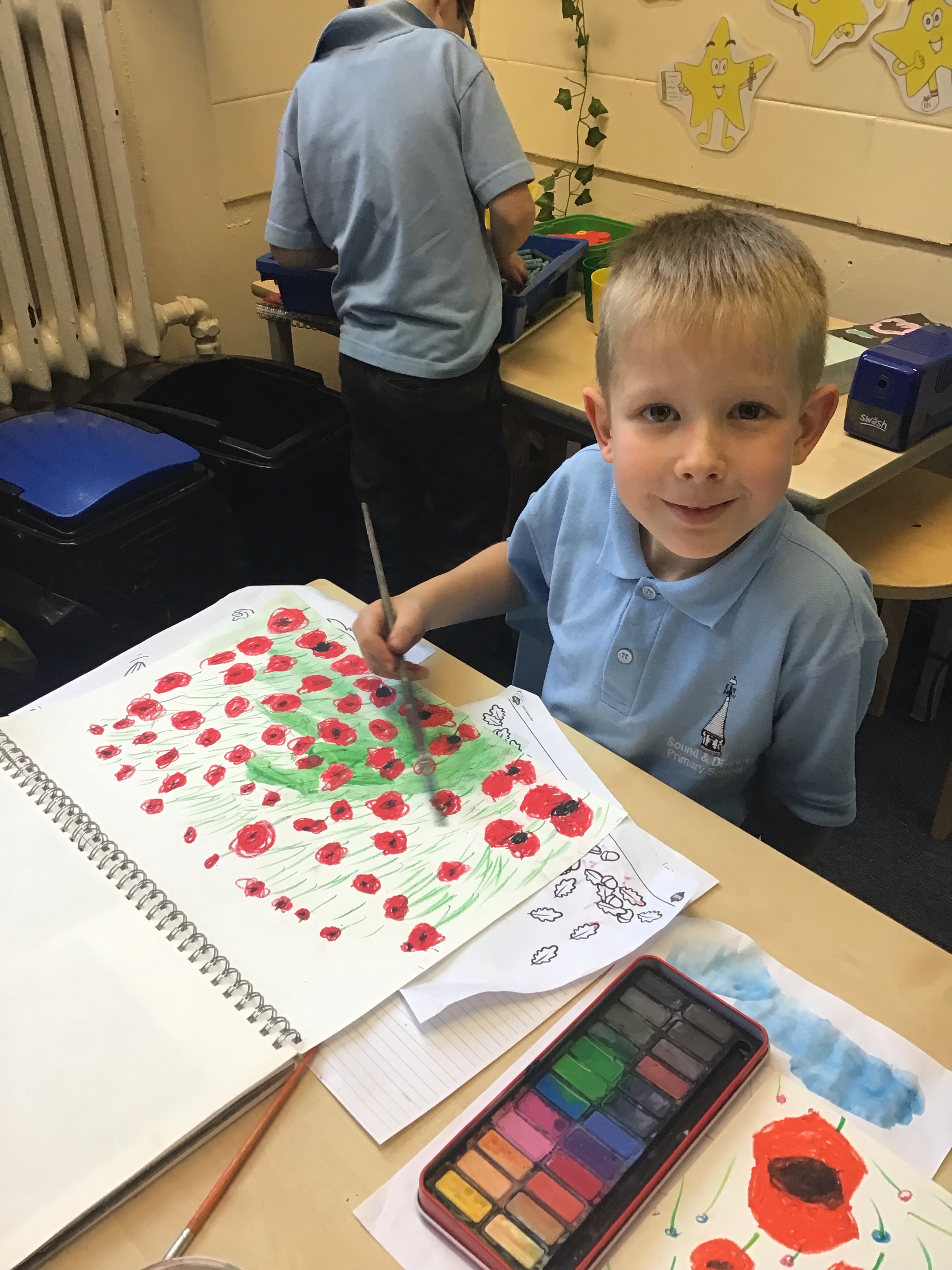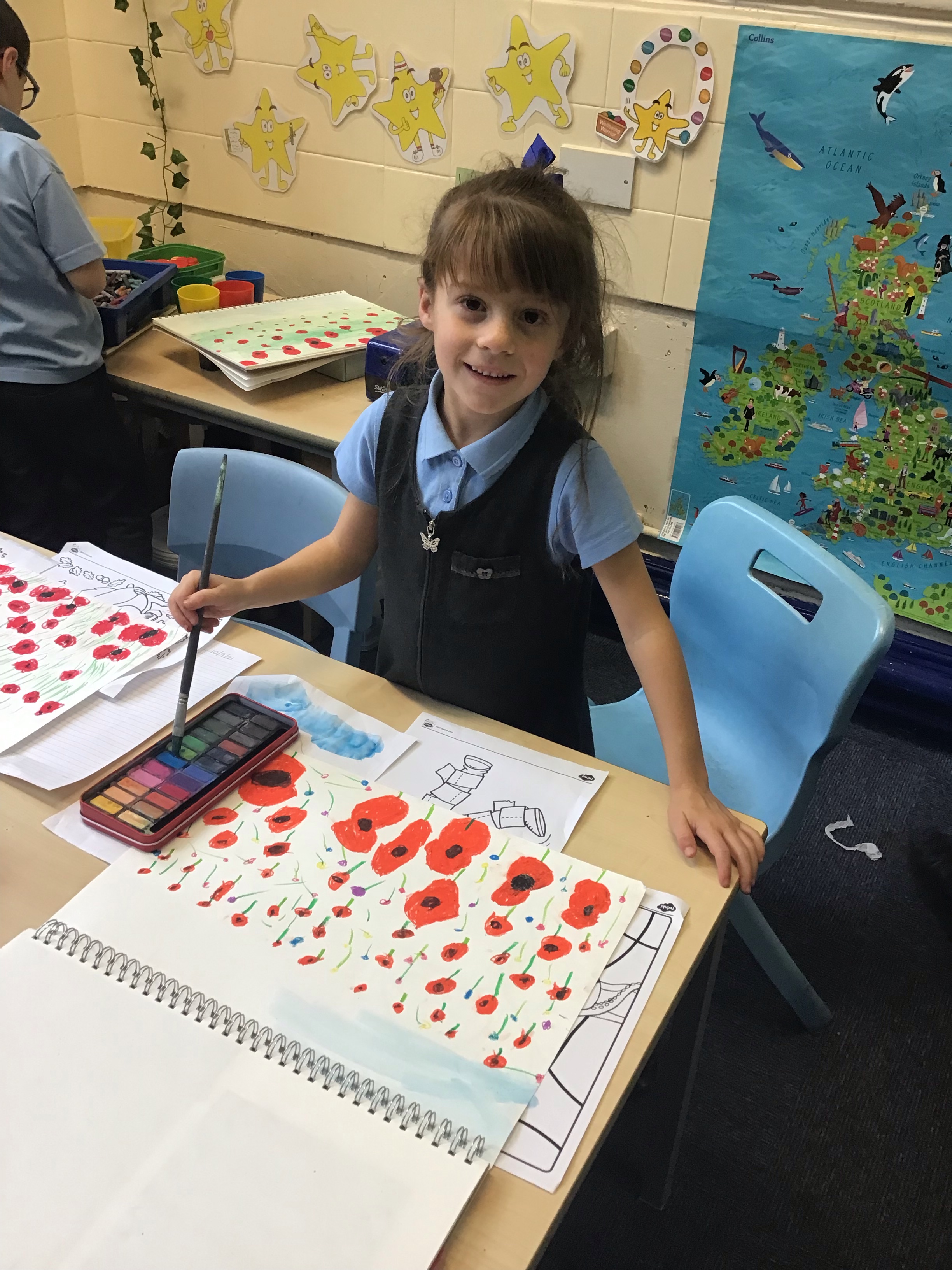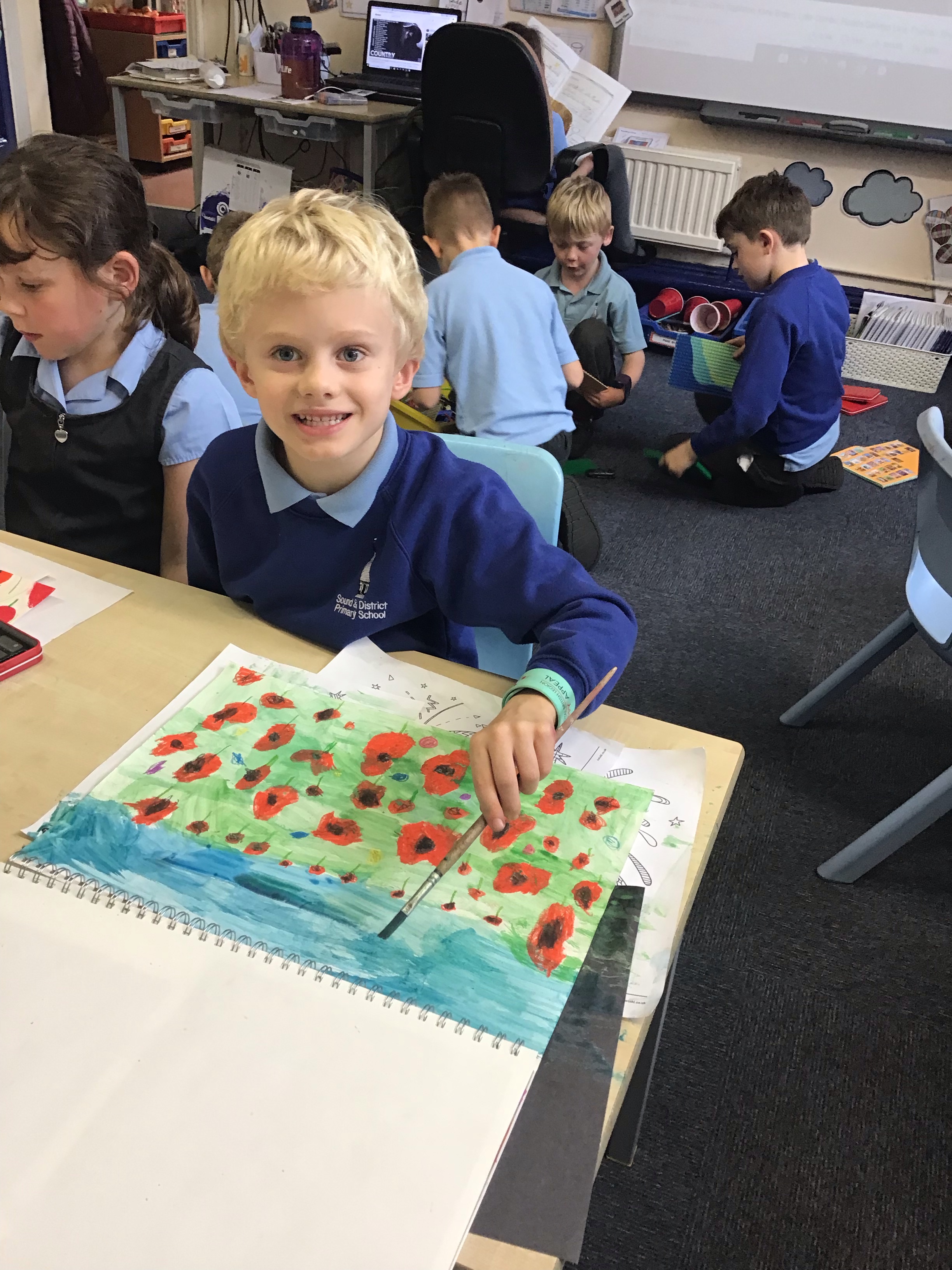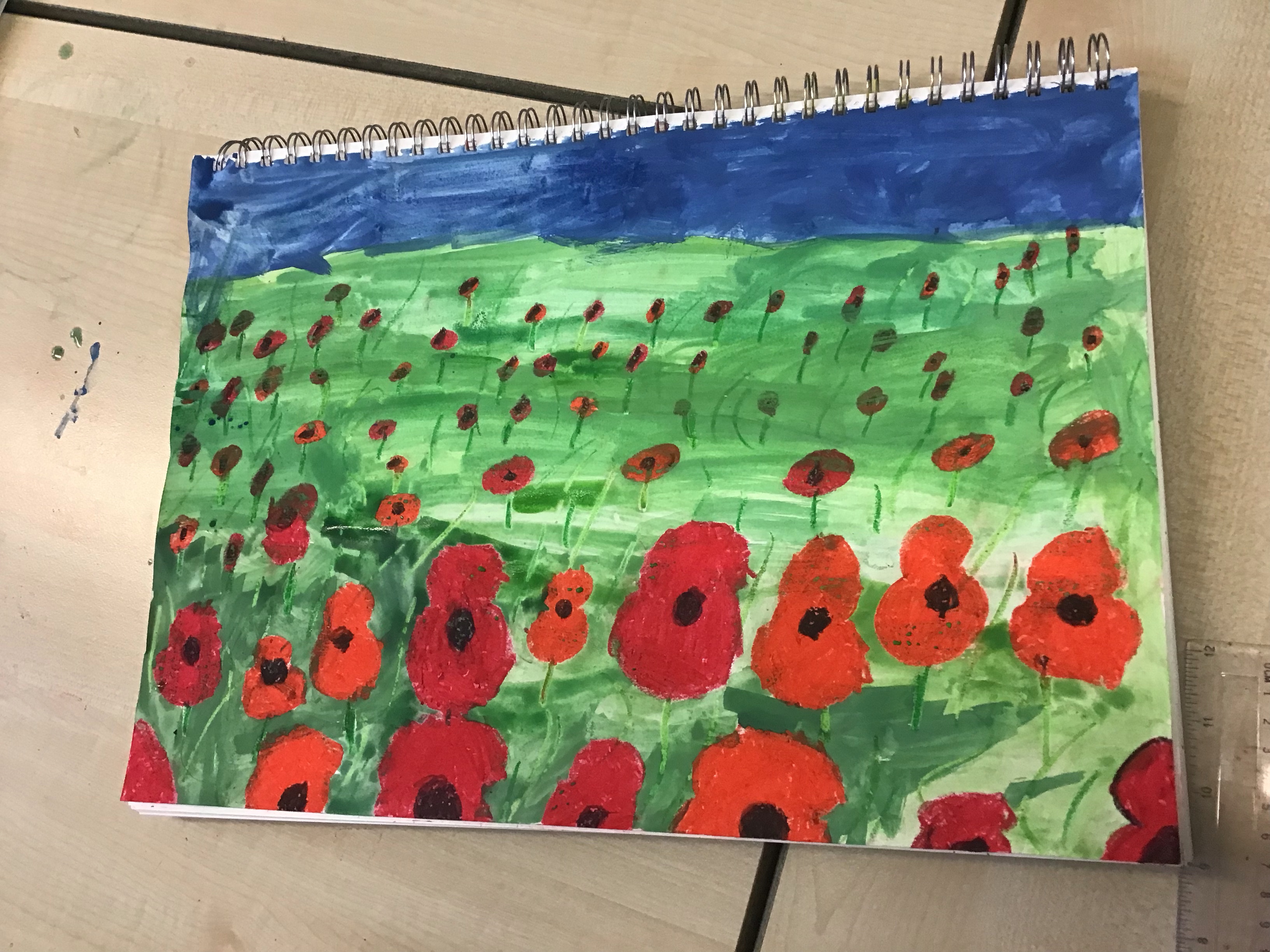To finish off the week, we enjoyed creating our own landscape pieces of art based on what we think Flanders field would look like when poppies grow each year. We used oil pastels and water colours to create our wonderful masterpieces. We talked about making sure the poppies in the foreground were larger than those in the middle and background.