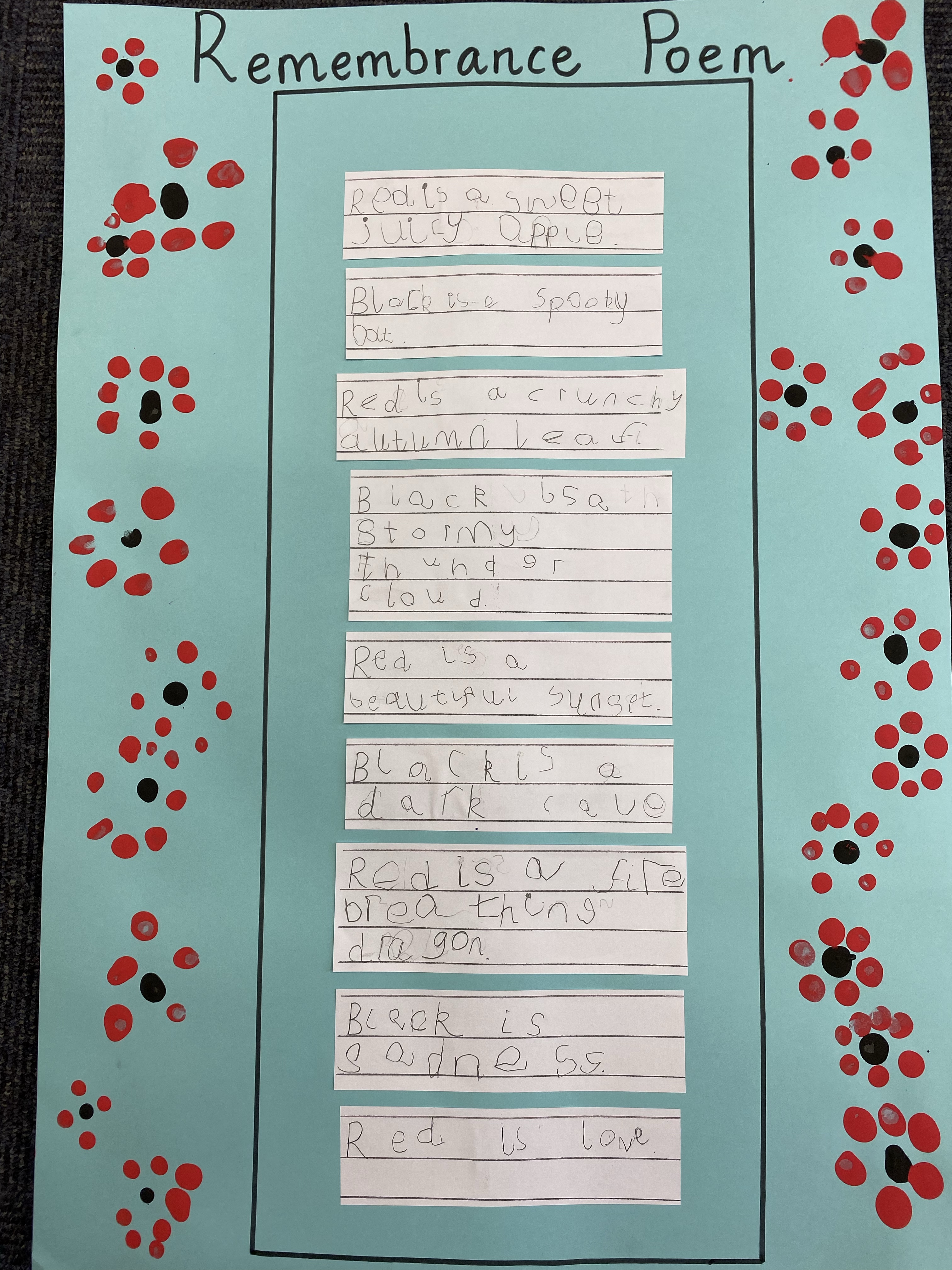 Today we had a wonderful Remembrance Day assembly with our whole school led by Onyx class (Year 5/6). We then went outside to our flagpole and lay a Remembrance wreath and showed our respect with a 2 minute silence. Following this we had some super Year 6’s come and read us some beautiful remembrance poetry. They read their poems off by heart and with lovely loud and clear voices. We were super proud of them all and have them lots of good feedback! 😀✏️⭐️