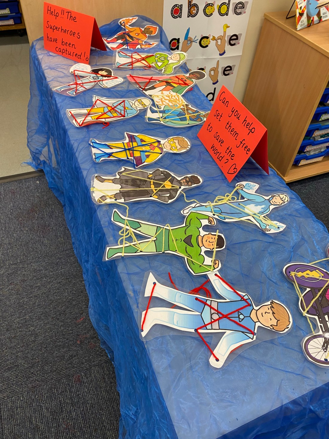 So far we’ve rescued captured superheroes by untangling them so they can save the day! This activity really helps our fingers! 😊