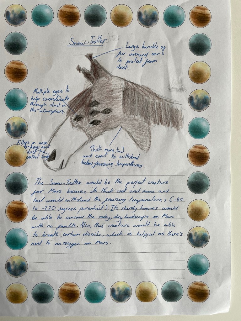 Although we know that there are no larger life forms on Mars, Onyx class researched the planet and created their own creatures, thinking about what adaptations it would need to survive on the planet. We found Mars is extremely cold, sandy, has little oxygen and lots of ice.
