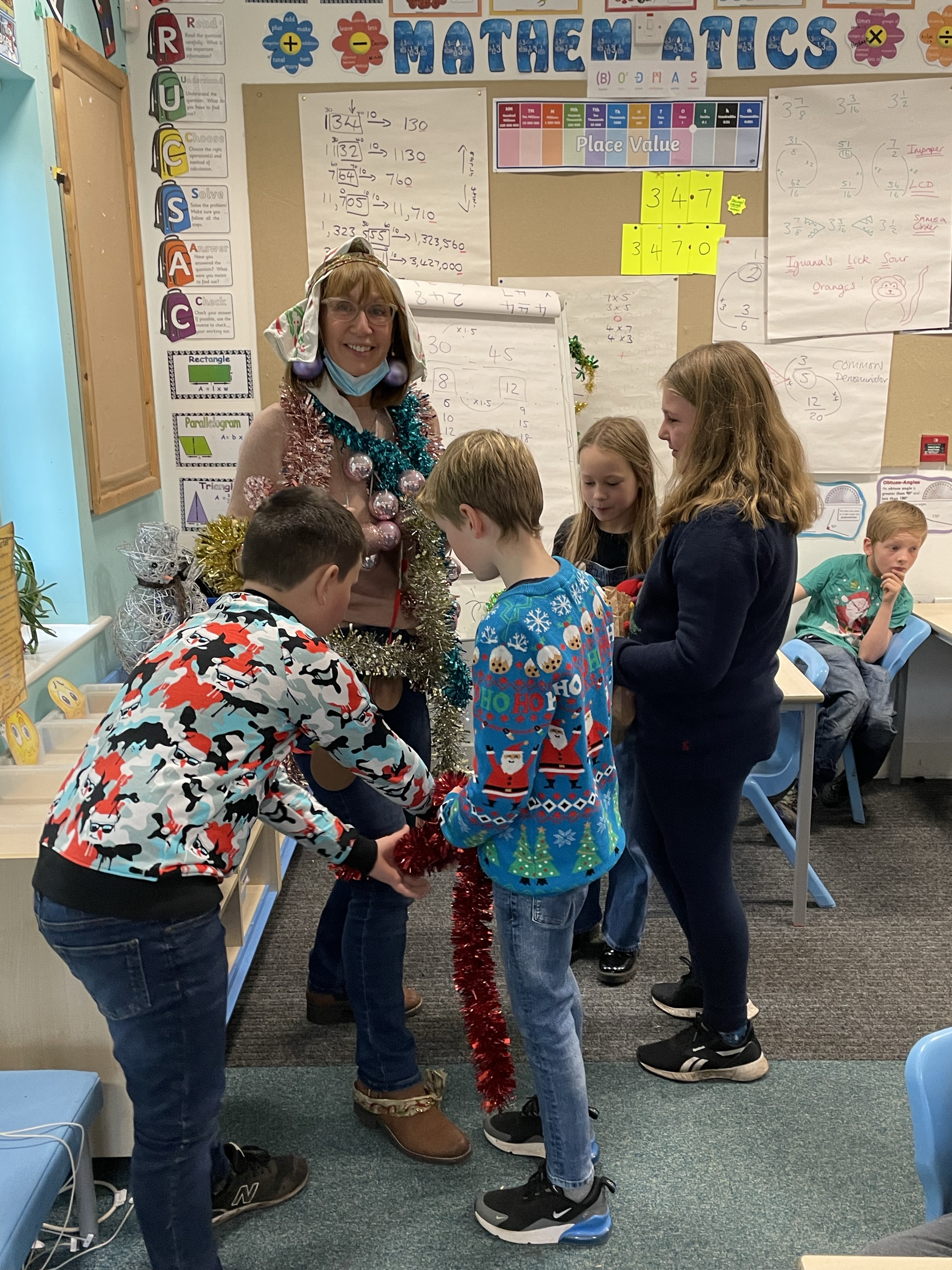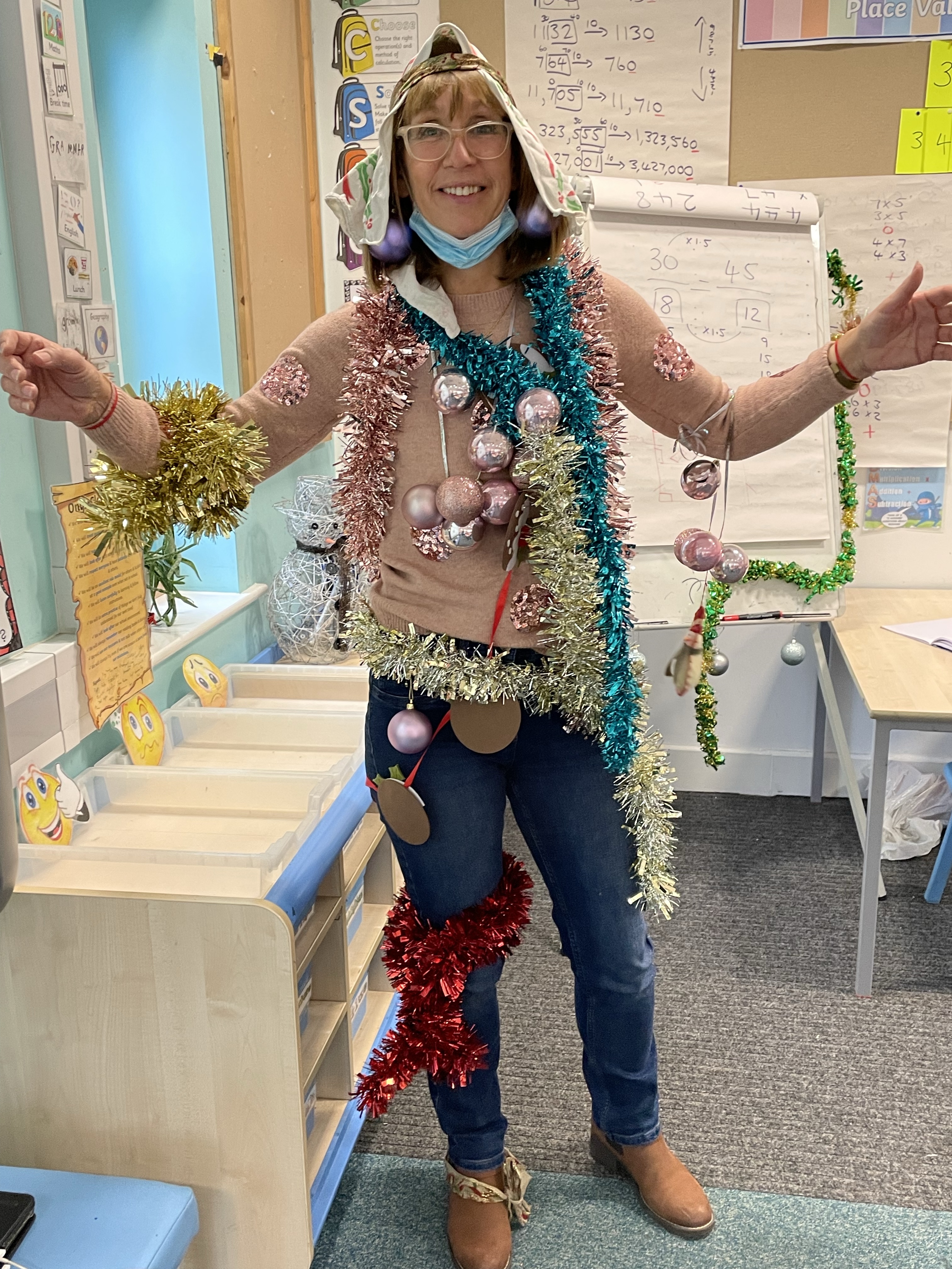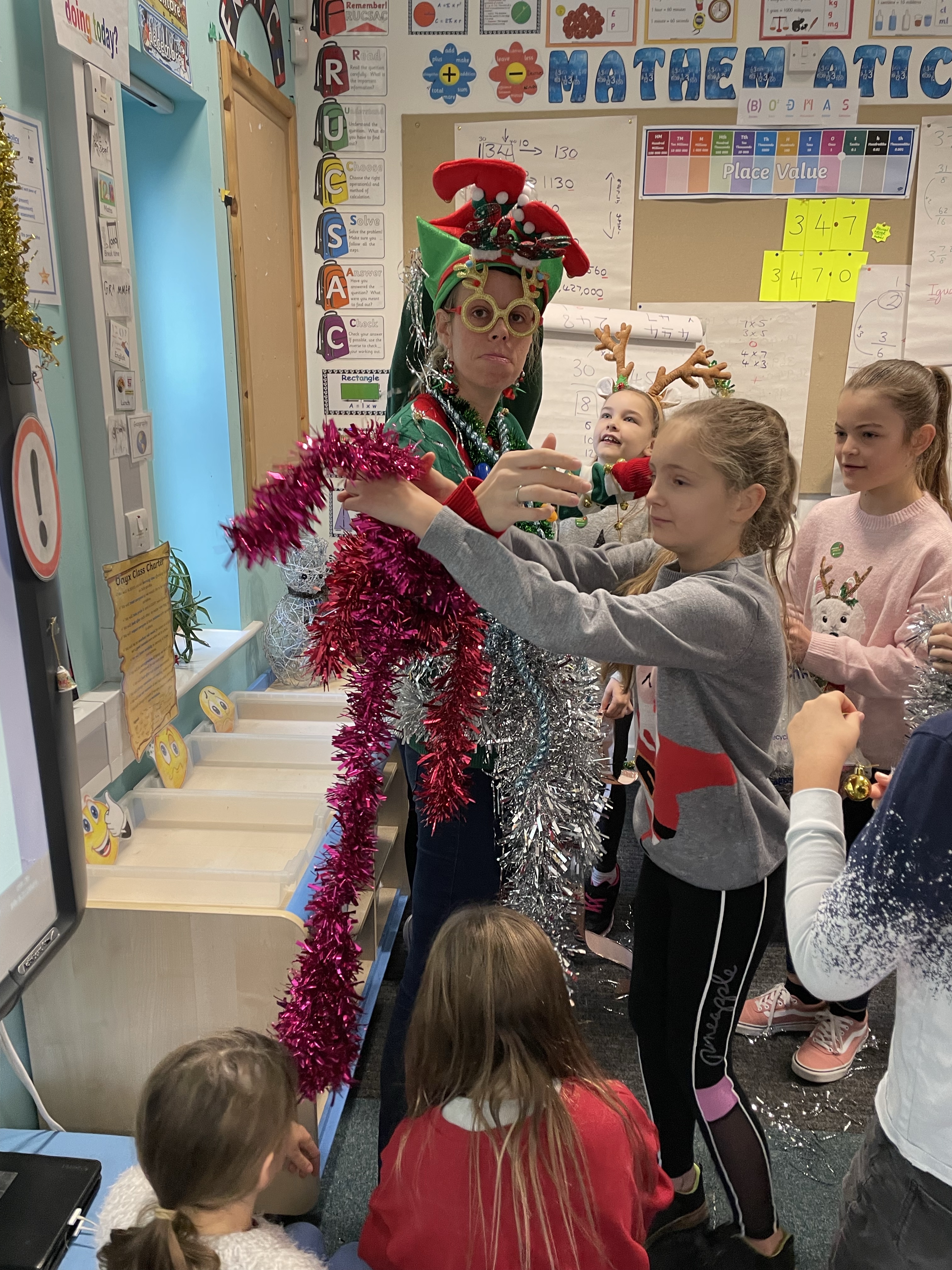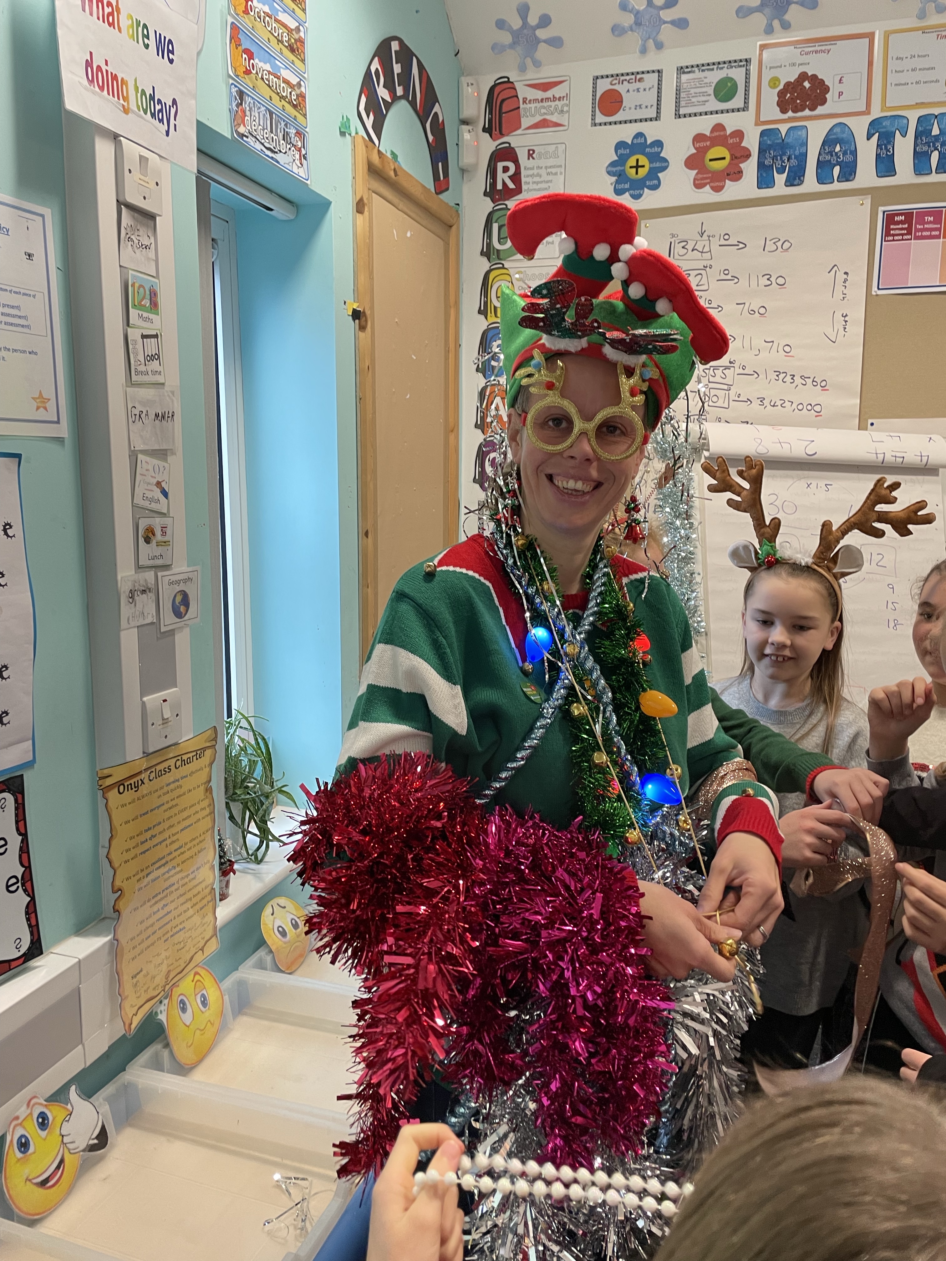 To start off the festivities, all the children got to ‘Tinsel Their Teachers’! Baubles, tinsel, flashing lights, bells…. no expense was spared! Mrs Cotterell and I had a wail of a time!