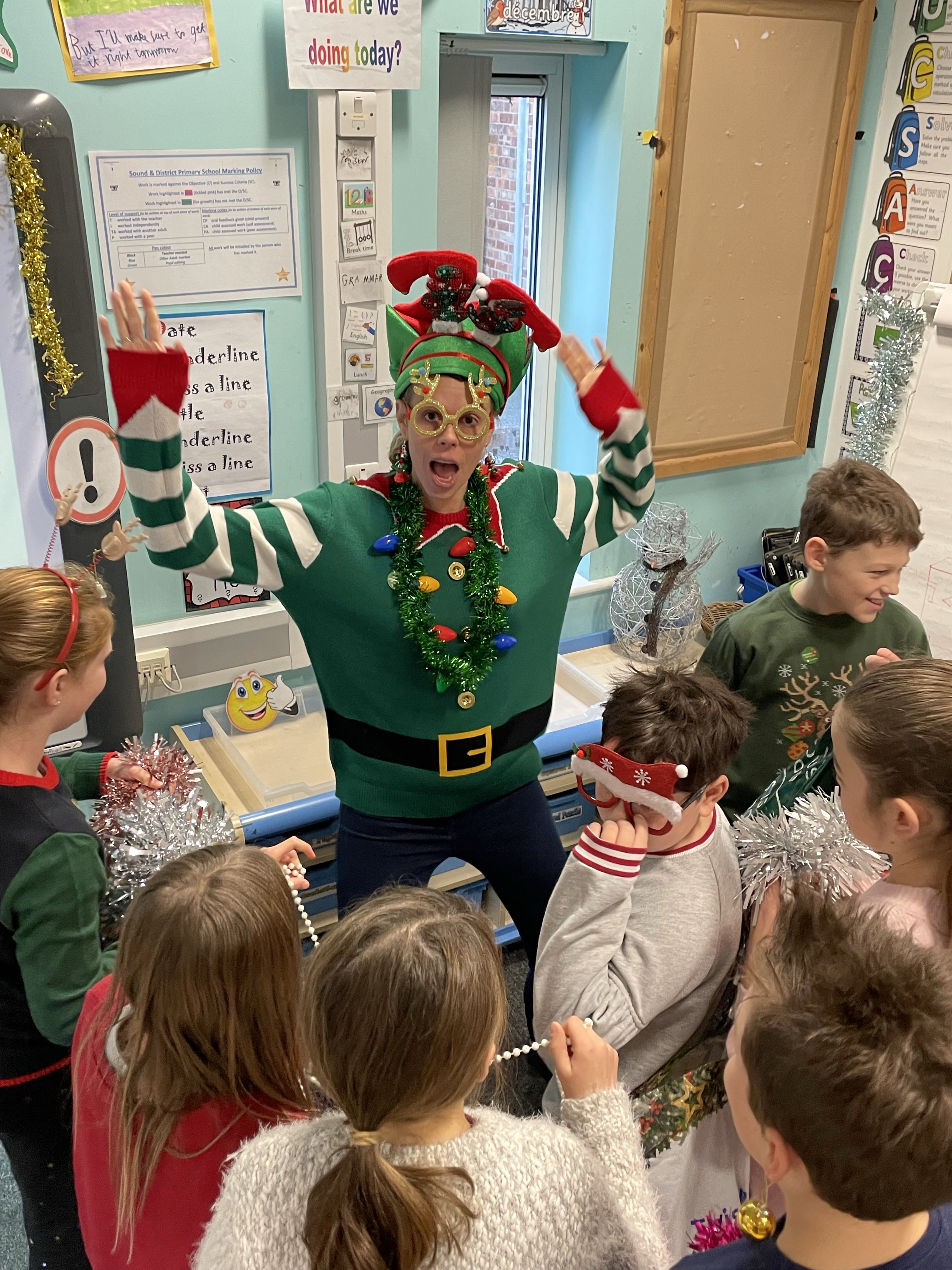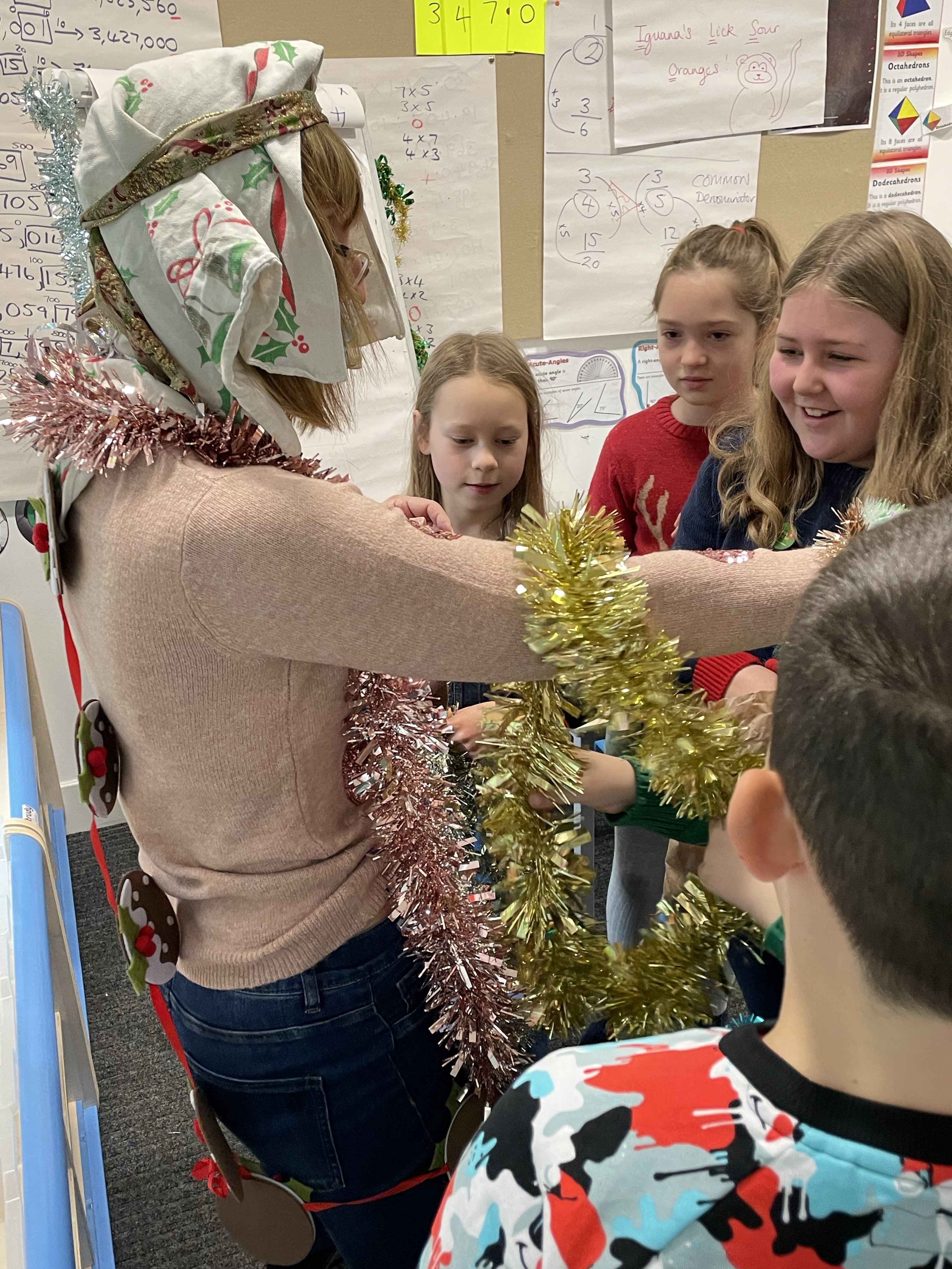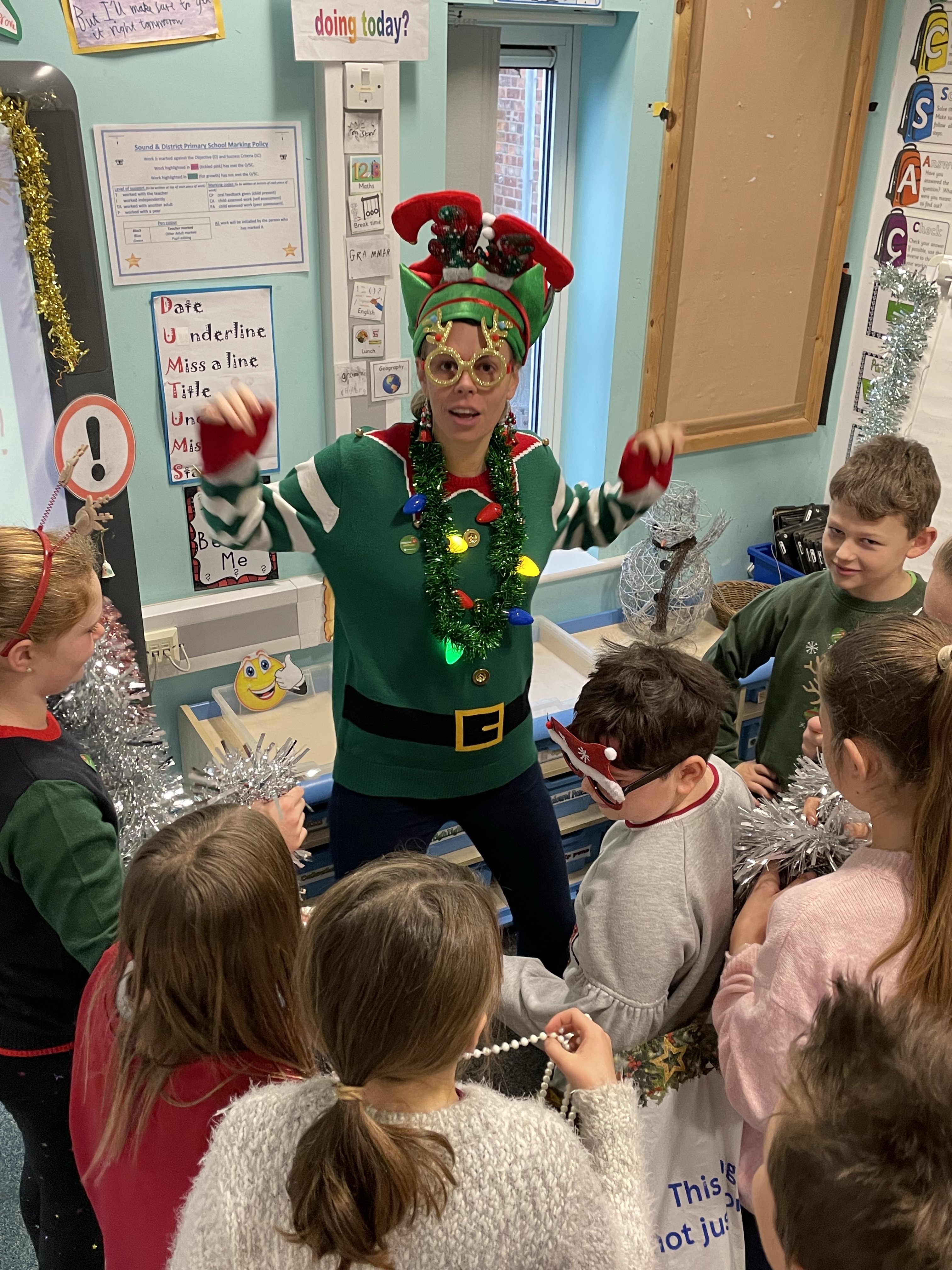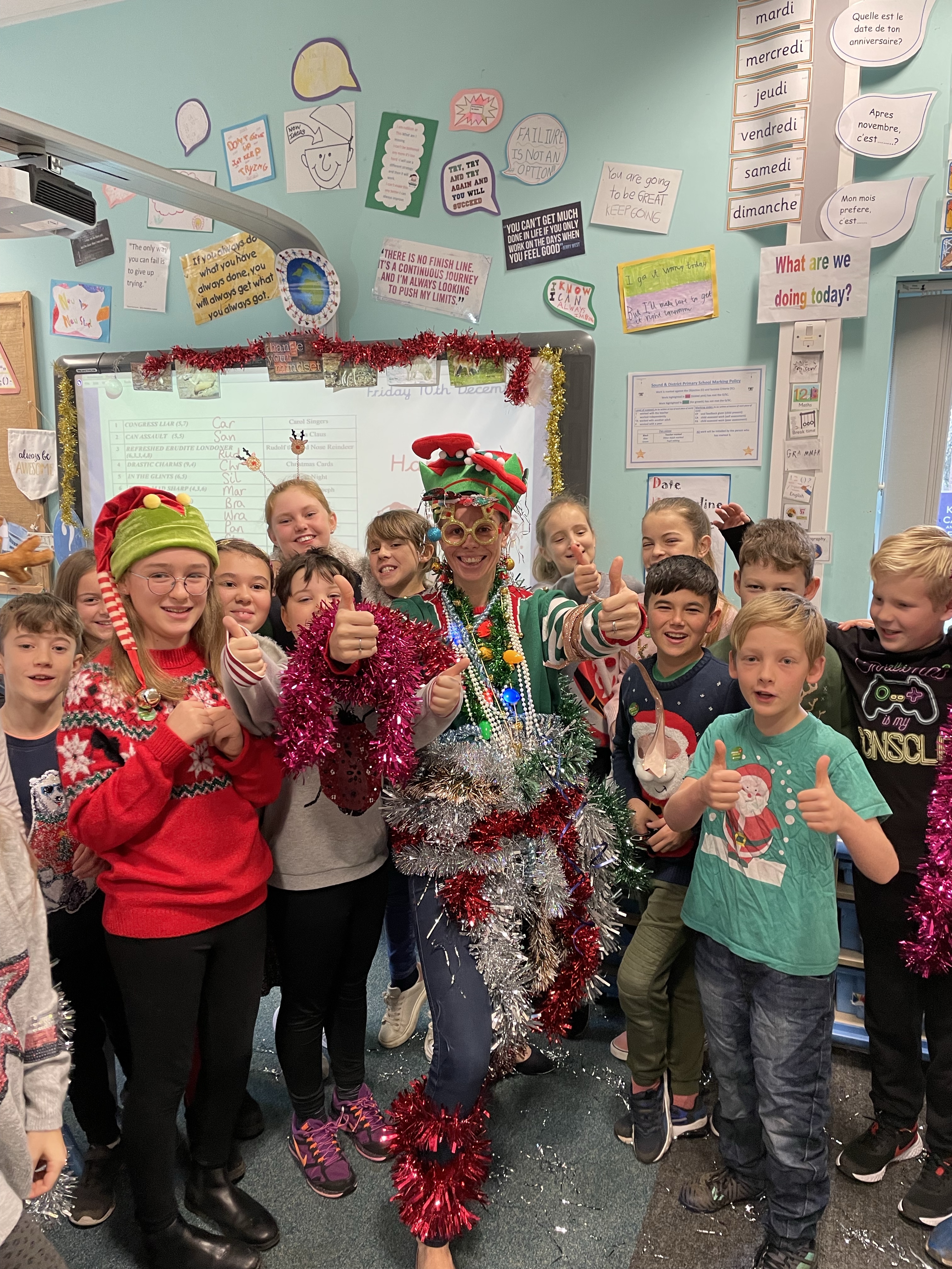 To start off the festivities, all the children got to ‘Tinsel Their Teachers’! Baubles, tinsel, flashing lights, bells…. no expense was spared! Mrs Cotterell and I had a wail of a time!