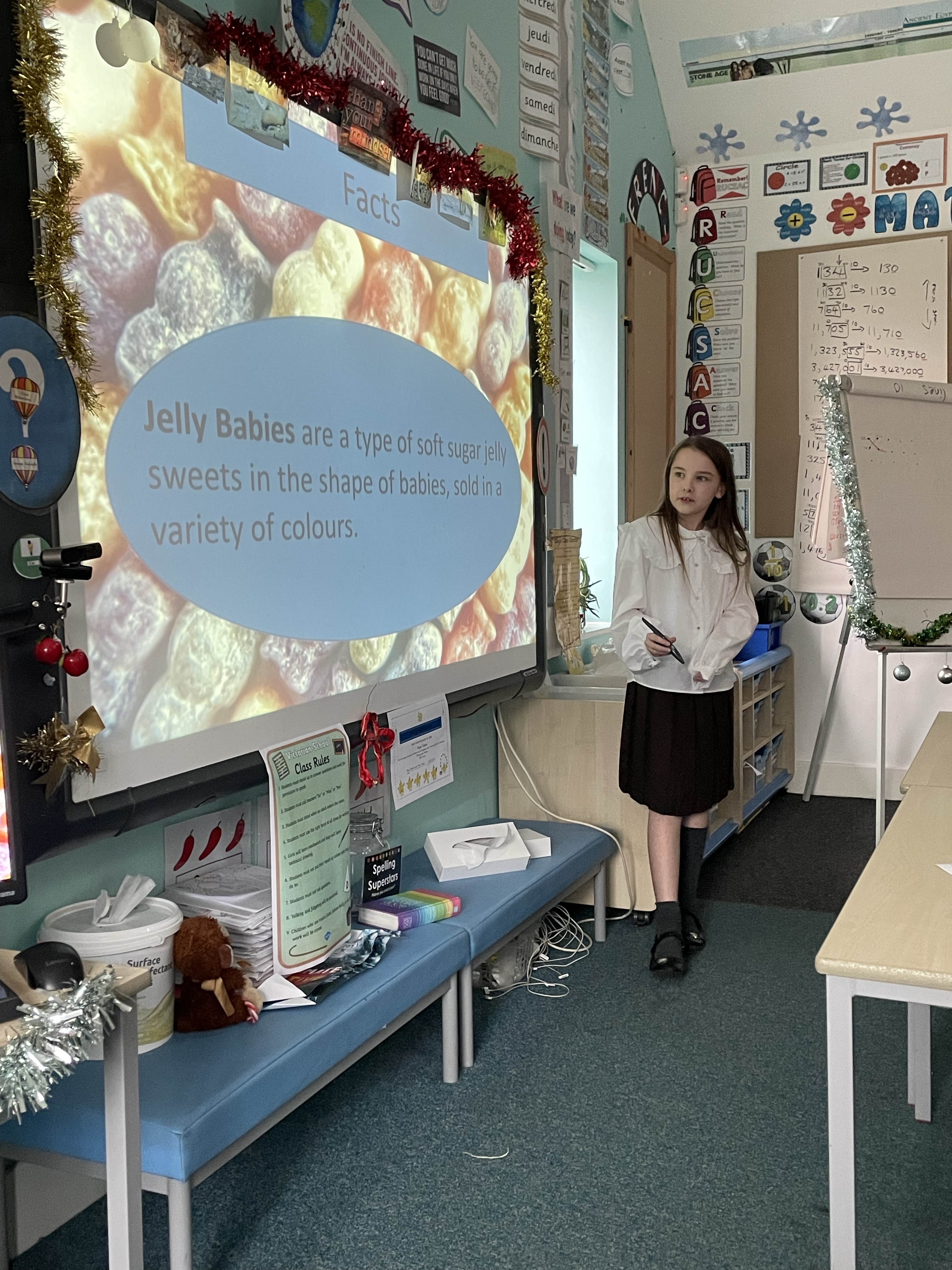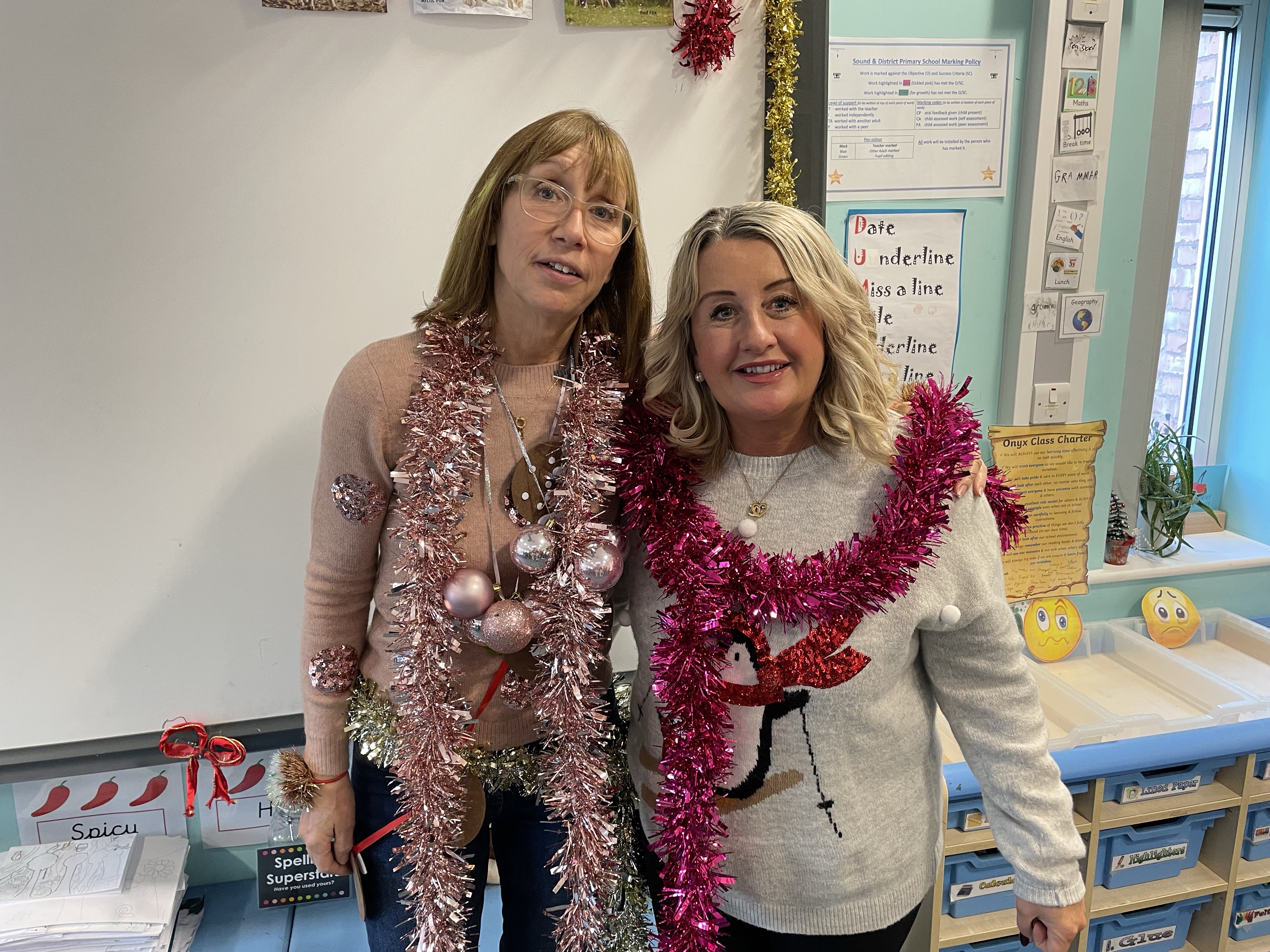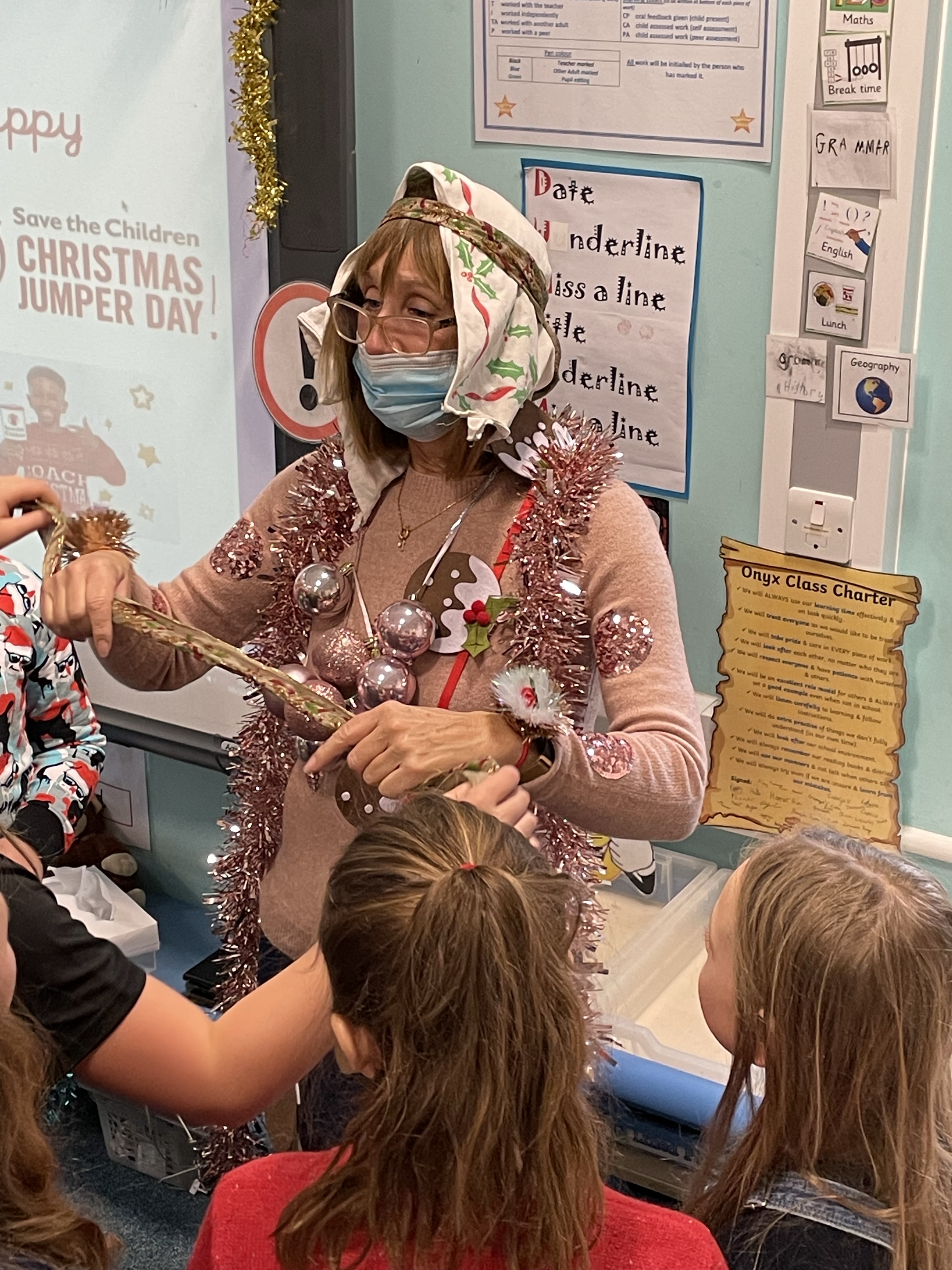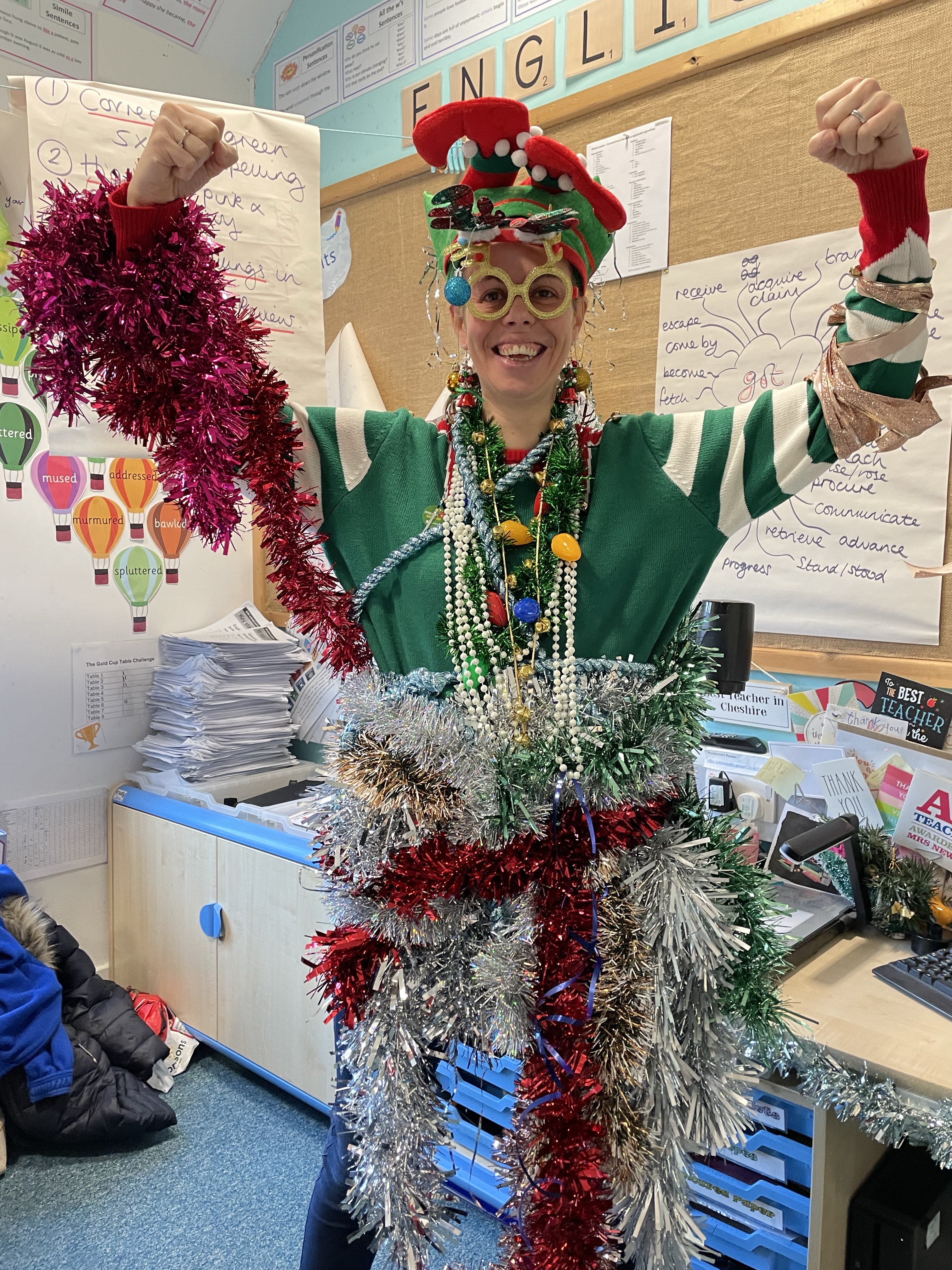 To start off the festivities, all the children got to ‘Tinsel Their Teachers’! Baubles, tinsel, flashing lights, bells…. no expense was spared! Mrs Cotterell and I had a wail of a time!