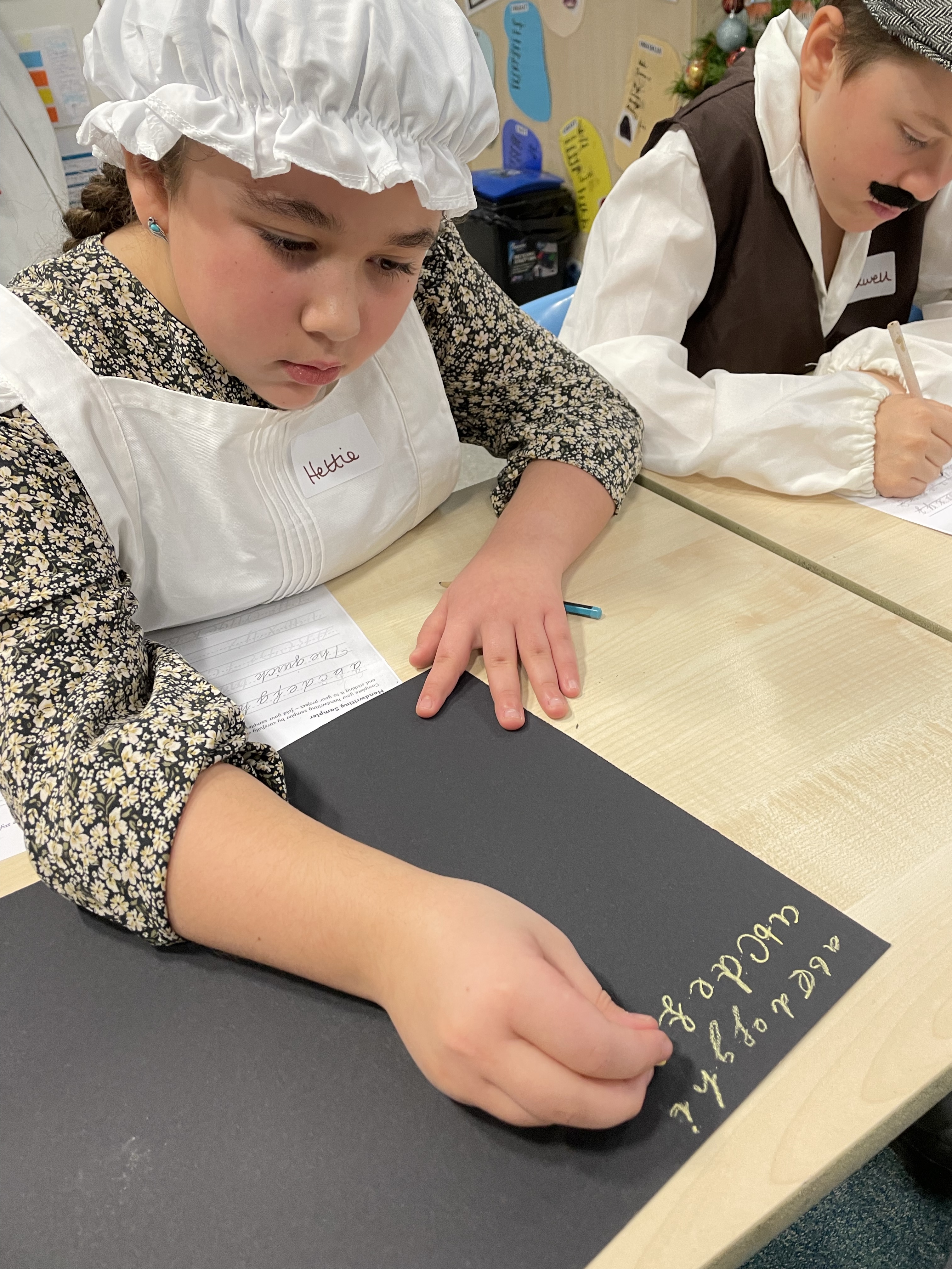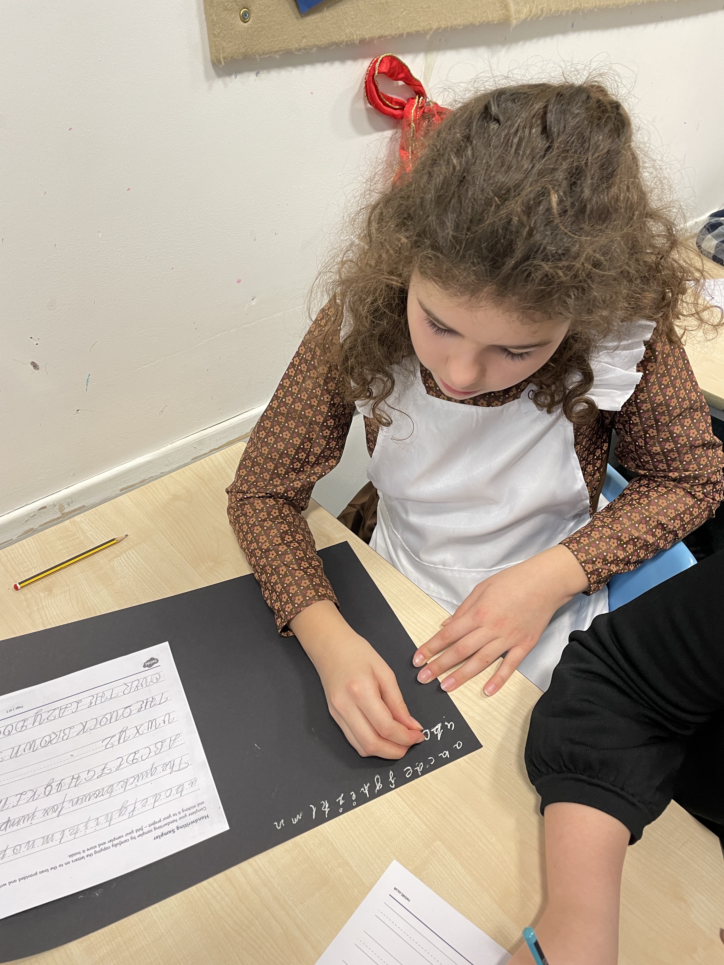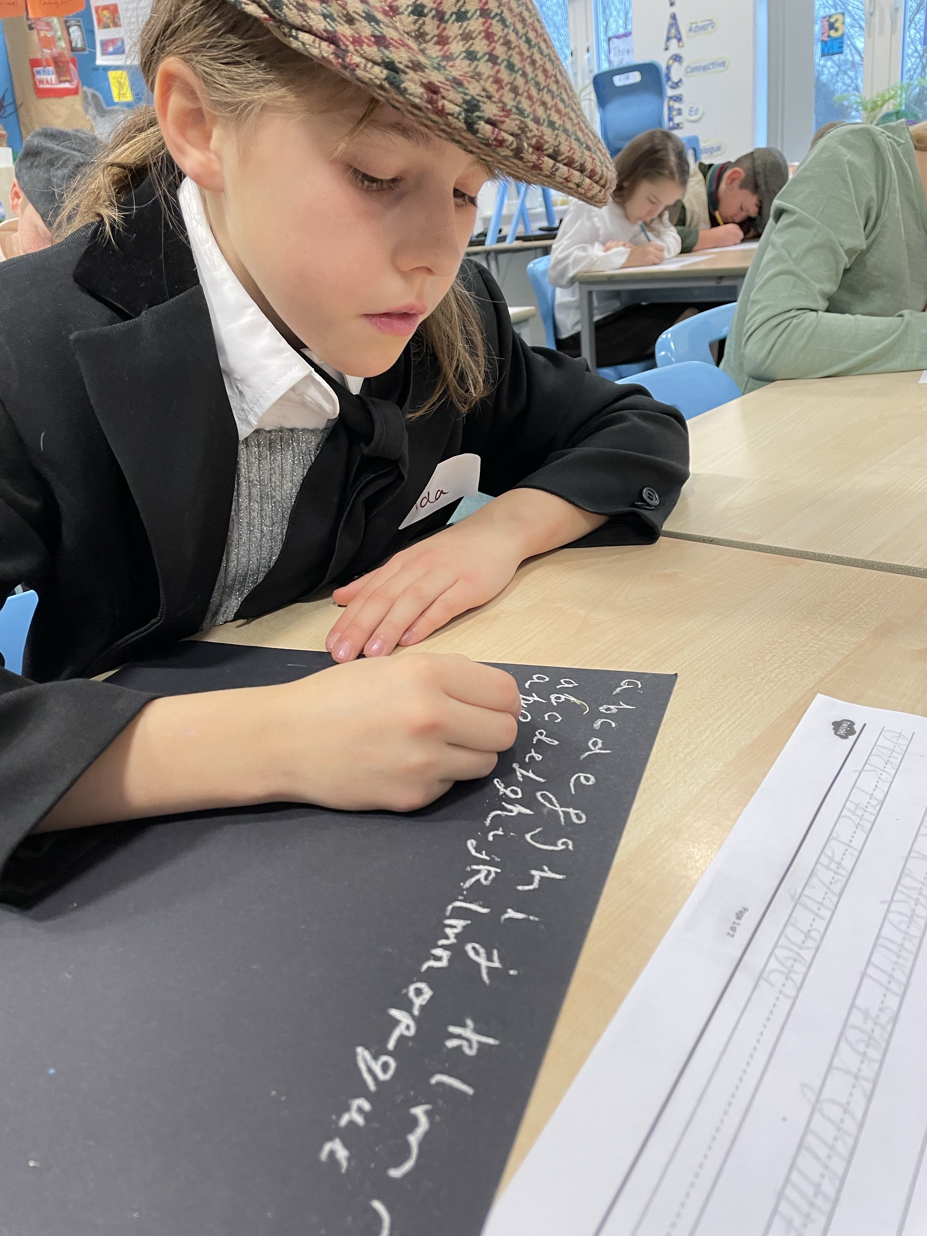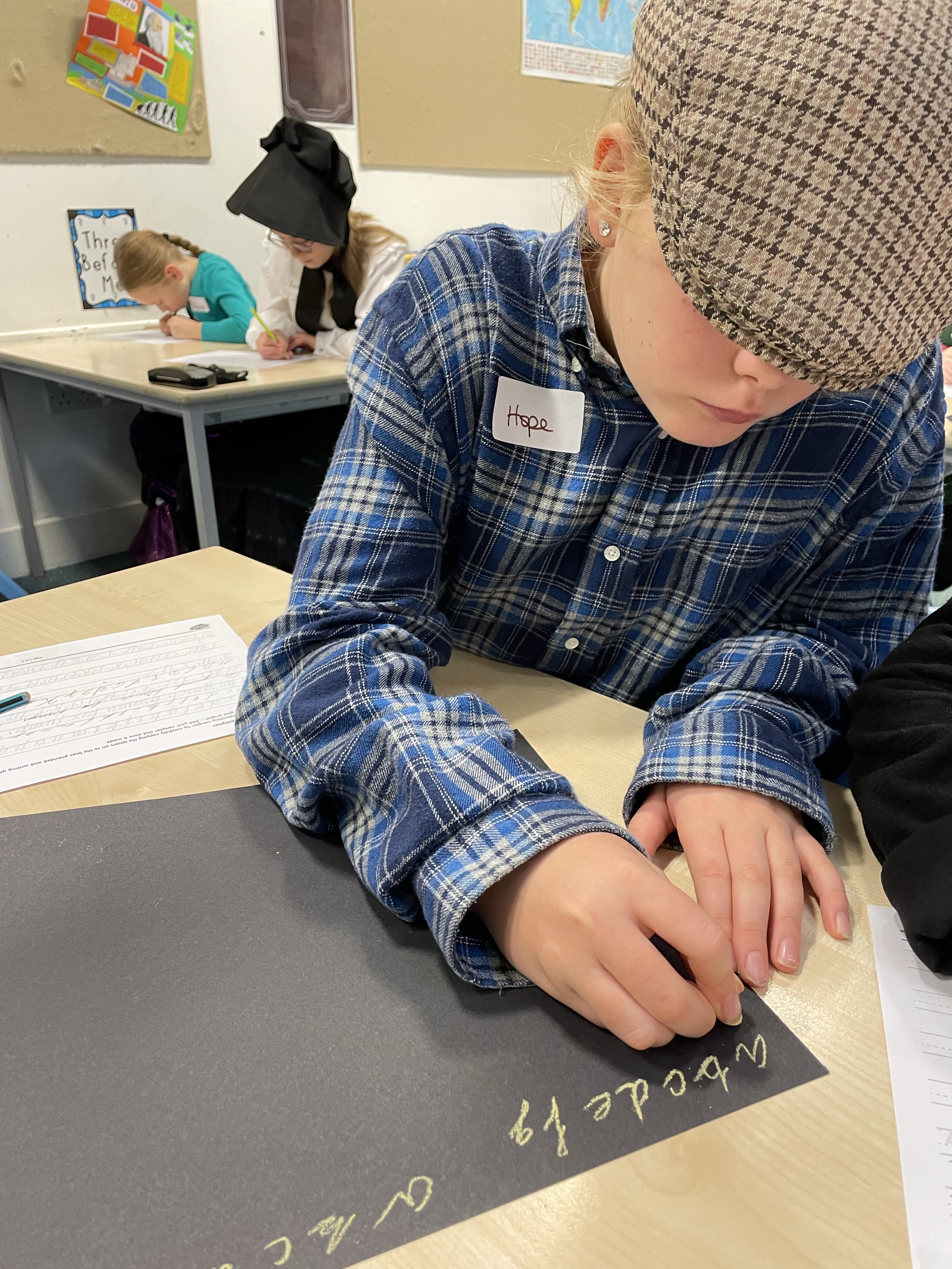 From the second they arrived on the playground they were split into boys and girls lines and given Victorian names for the day. Nail and cleanliness checks followed before times tables chanting and deportment lesson (otherwise know as balancing a book on your head!) On returning to the classroom, we showed our respect to Queen Victoria with the National Anthem, learnt our school rules: to stand when answering questions; to address your elders with Sir, Miss or Mrs etc etc It was clear the phrase “children are to be seen and not heard” was going to be a key part of the day! Then, it was on to handwriting practice. We found it really difficult writing with chalk, especially because all Victorian children had to write with their right hand! Sorry lefties!