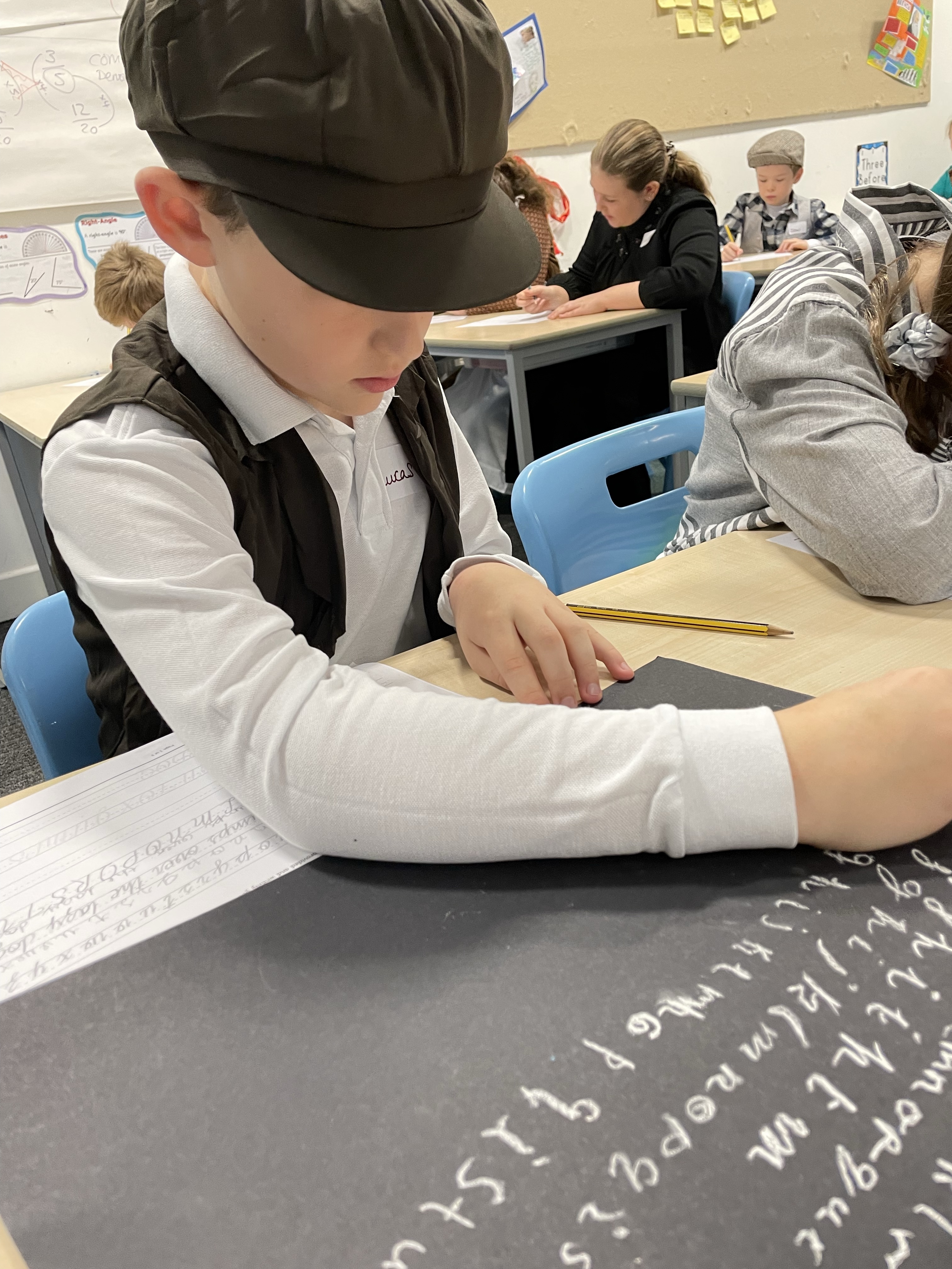 From the second they arrived on the playground, they were split into boys and girls lines and given Victorian names for the day. Nail and cleanliness checks followed before times tables chanting and deportment lesson (otherwise know as balancing a book on your head!) On returning to the classroom, we showed our respect to Queen Victoria with the National Anthem, learnt our school rules: to stand when answering questions; to address your elders with Sir, Miss or Mrs etc. It was clear the phrase “children are to be seen and not heard” was going to be a key part of the day! Then, it was on to handwriting practice. We found it really difficult writing with chalk, especially because all Victorian children had to write with their right hand! Sorry lefties!