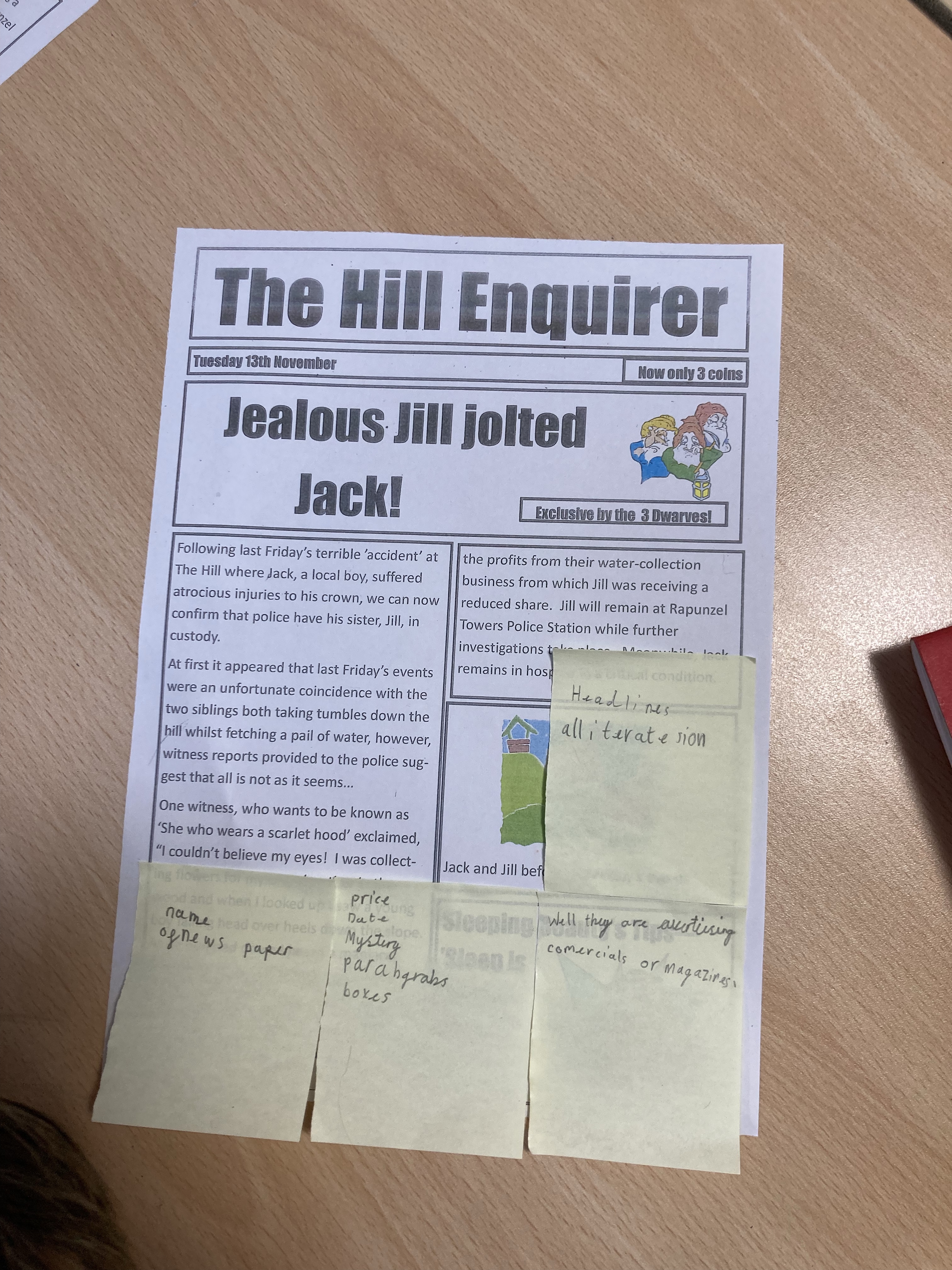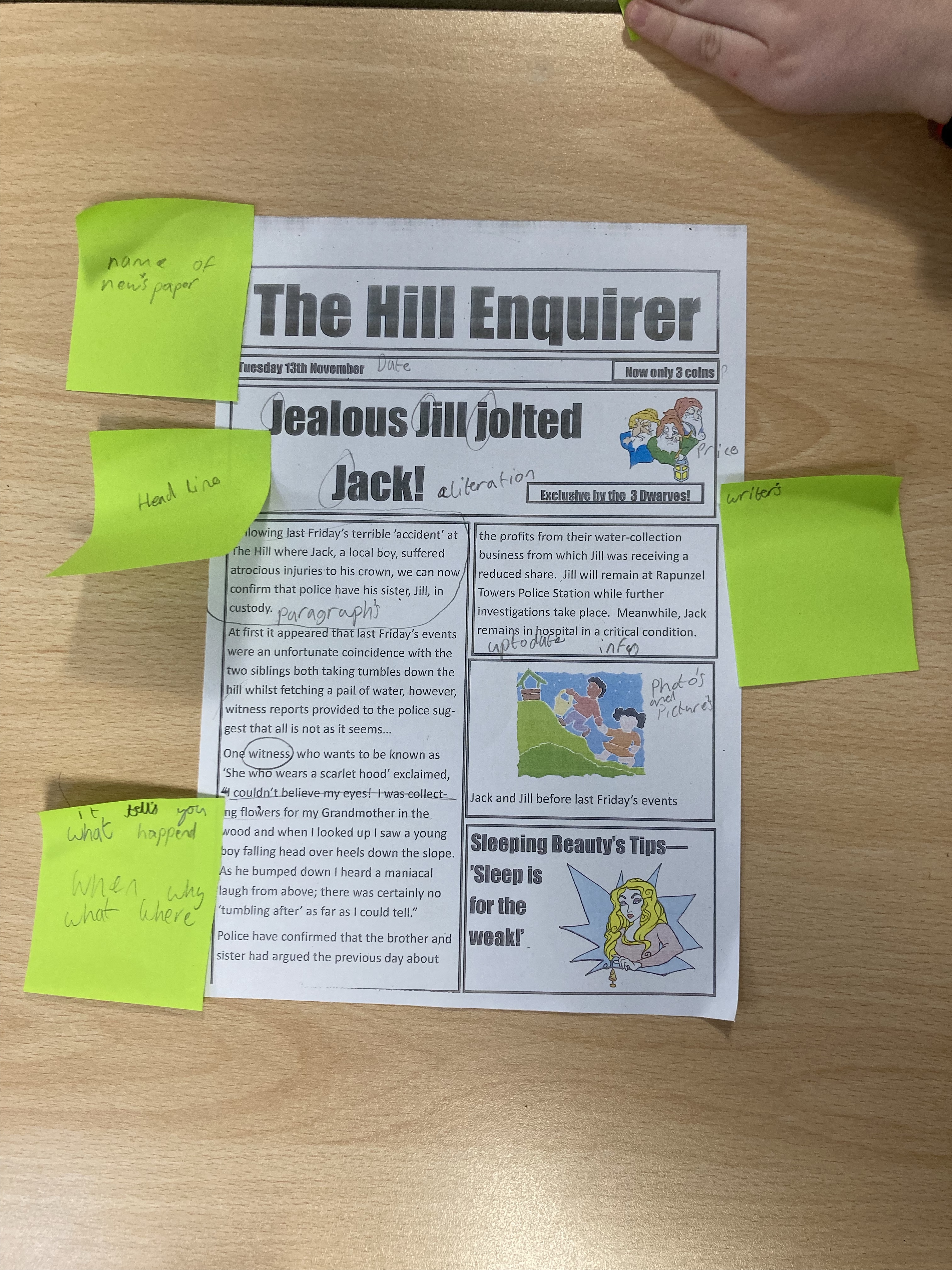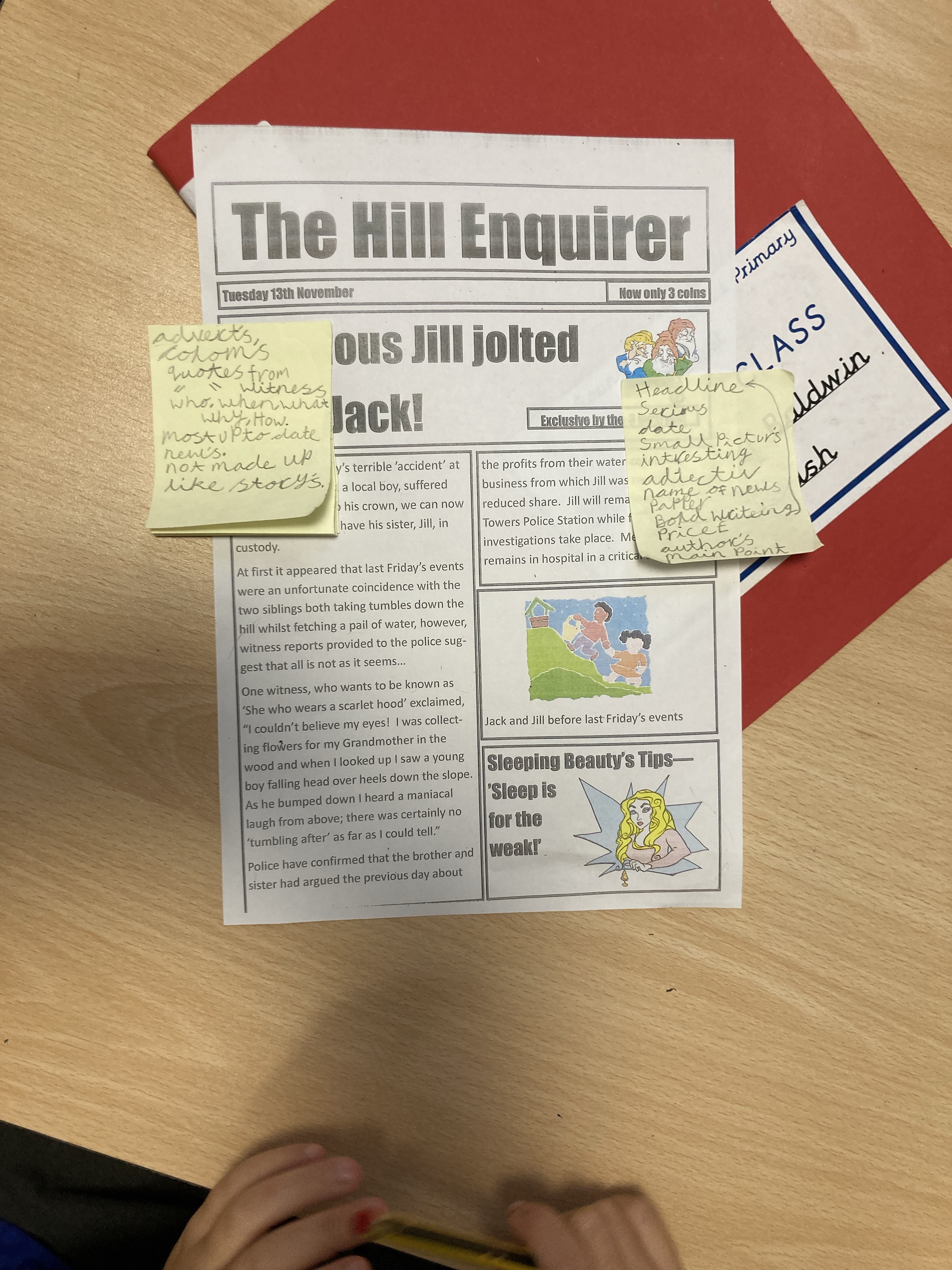 This week , Topaz class have been looking very carefully at a selection of newspaper reports and identifying the key features: headlines, 5 Ws, advertising, captions, direct and indirect quotes.