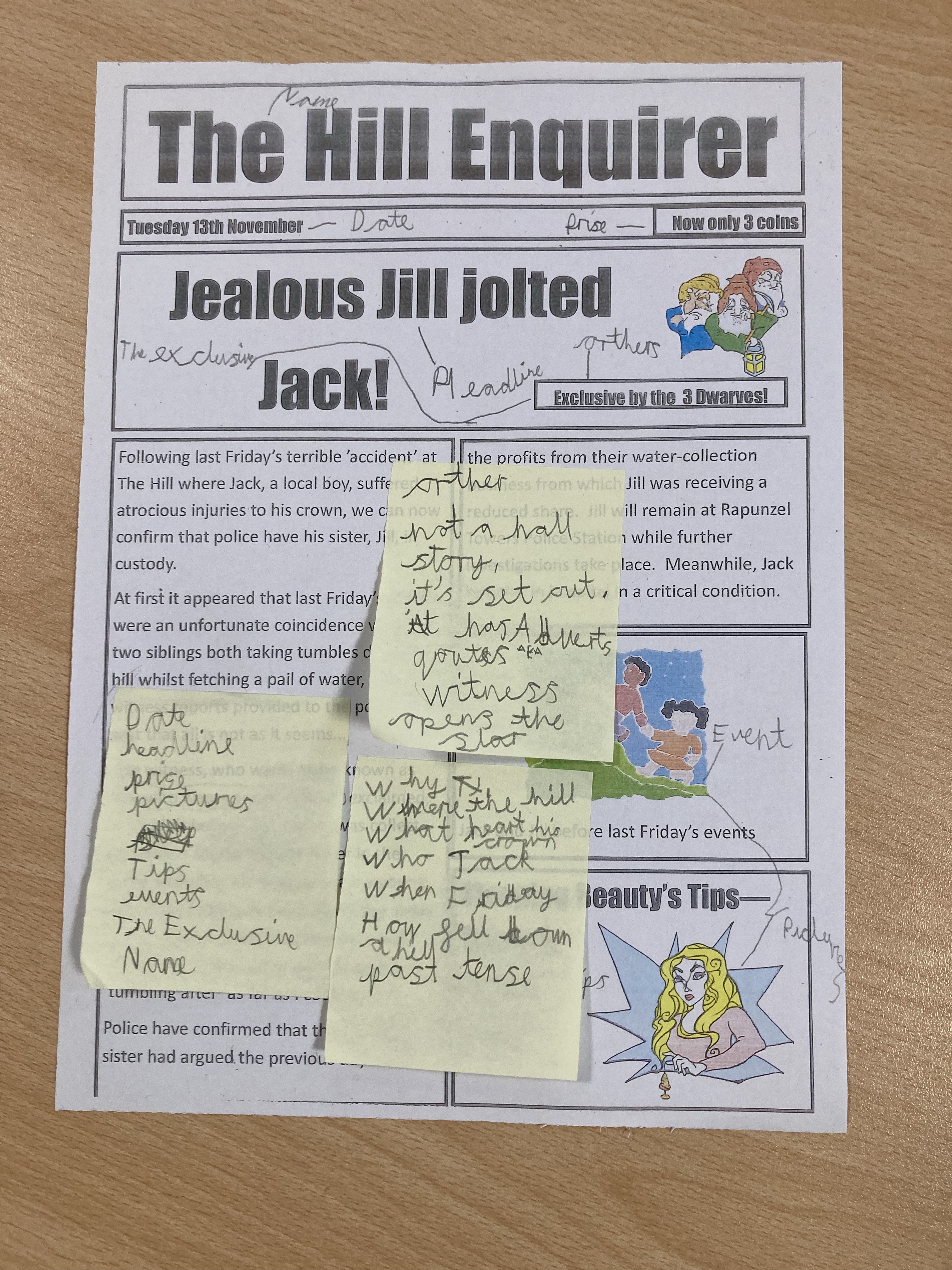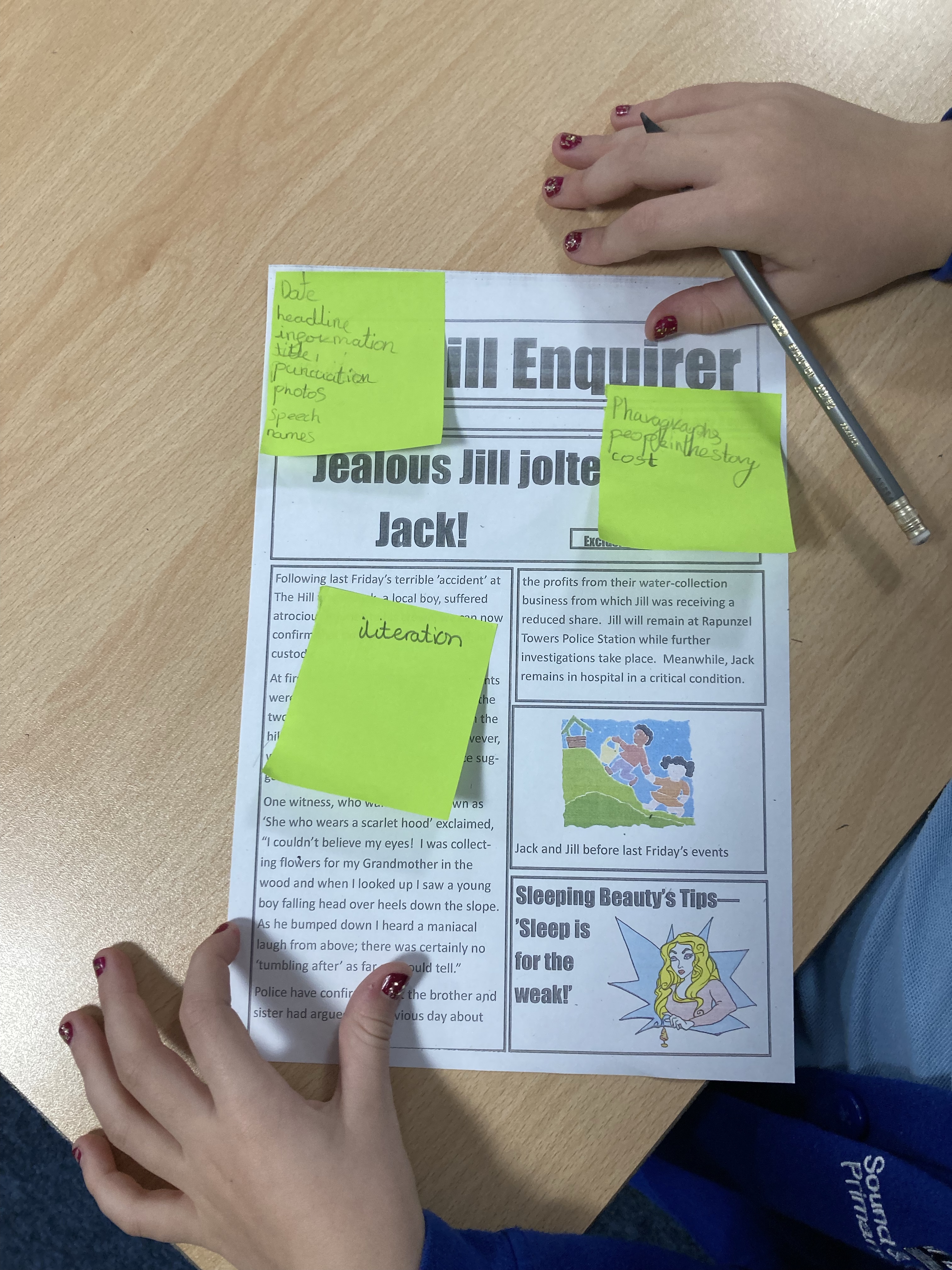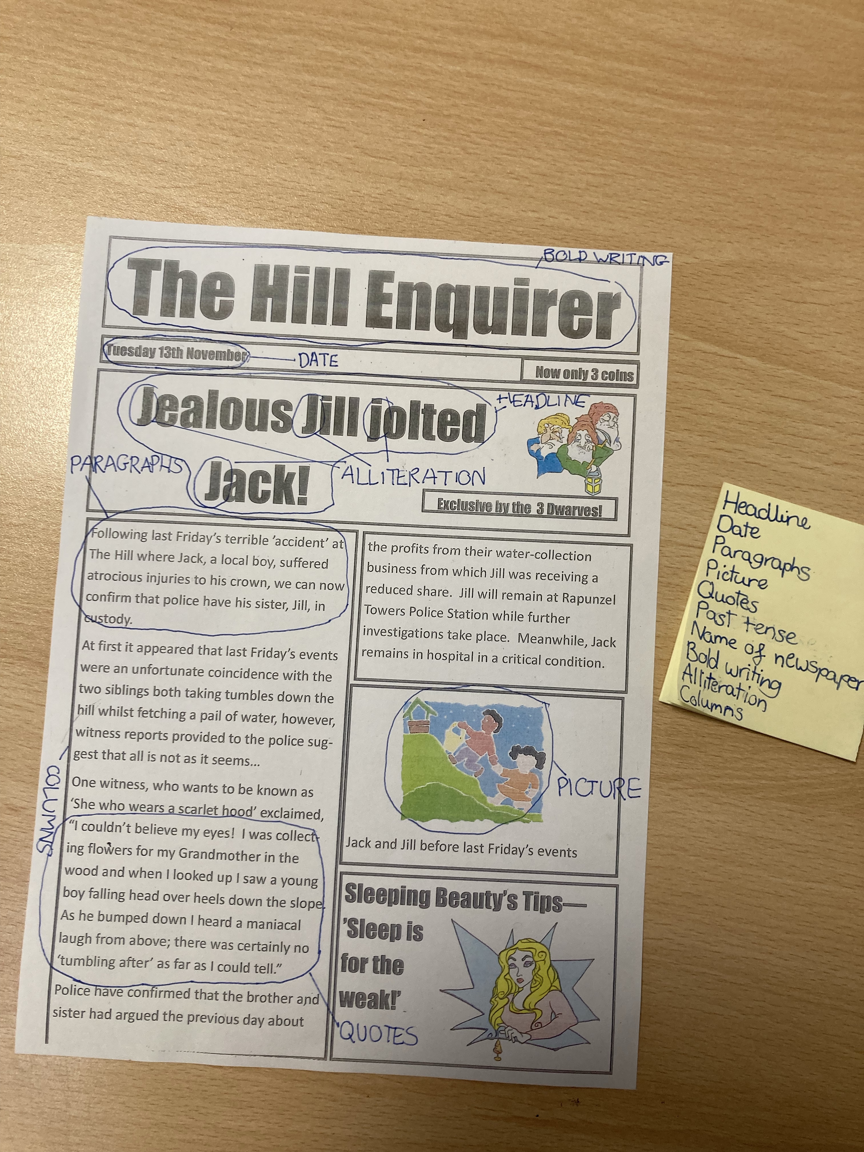 This week , Topaz class have been looking very carefully at a selection of newspaper reports and identifying the key features: headlines, 5 Ws, advertising, captions, direct and indirect quotes.