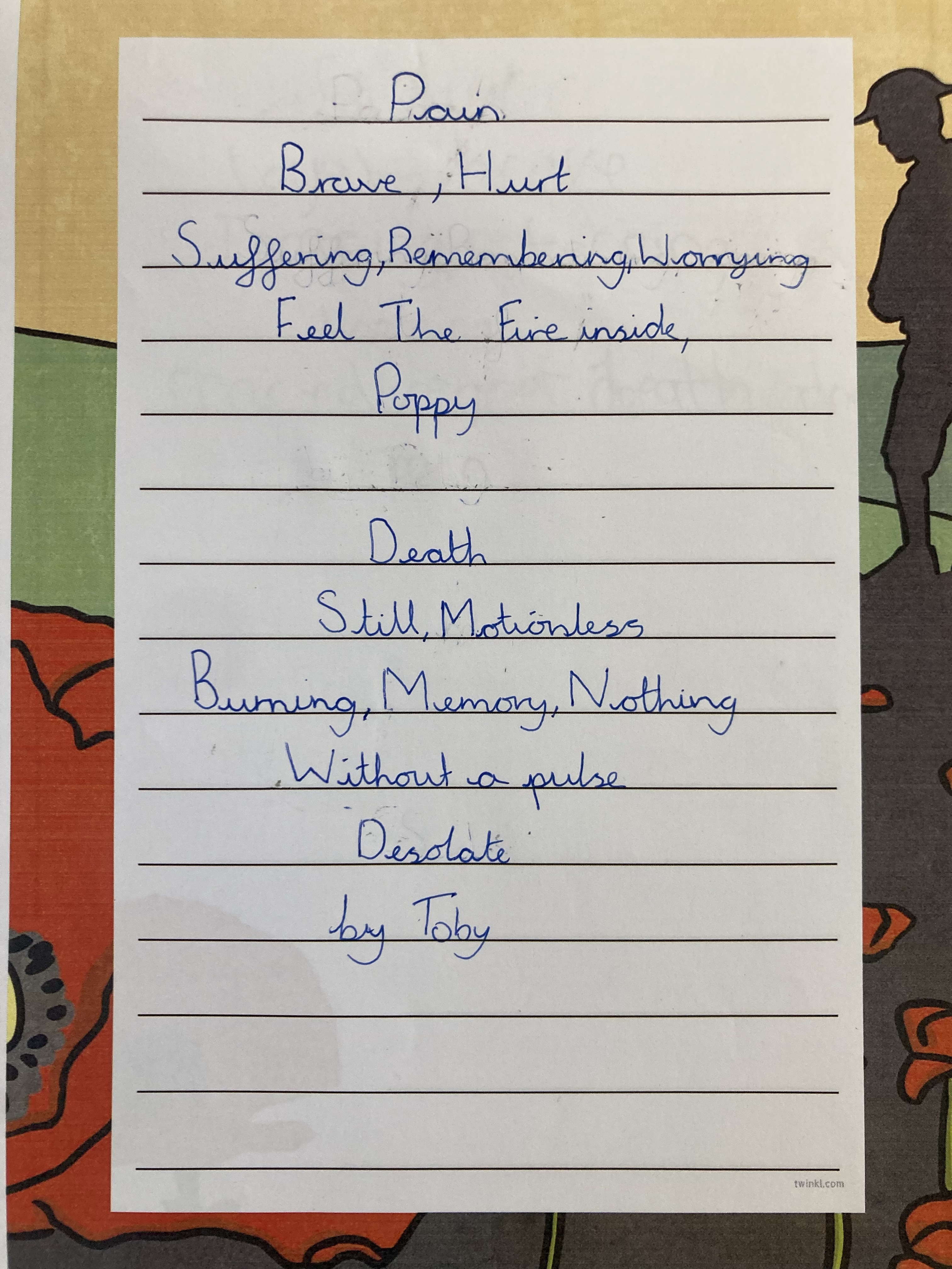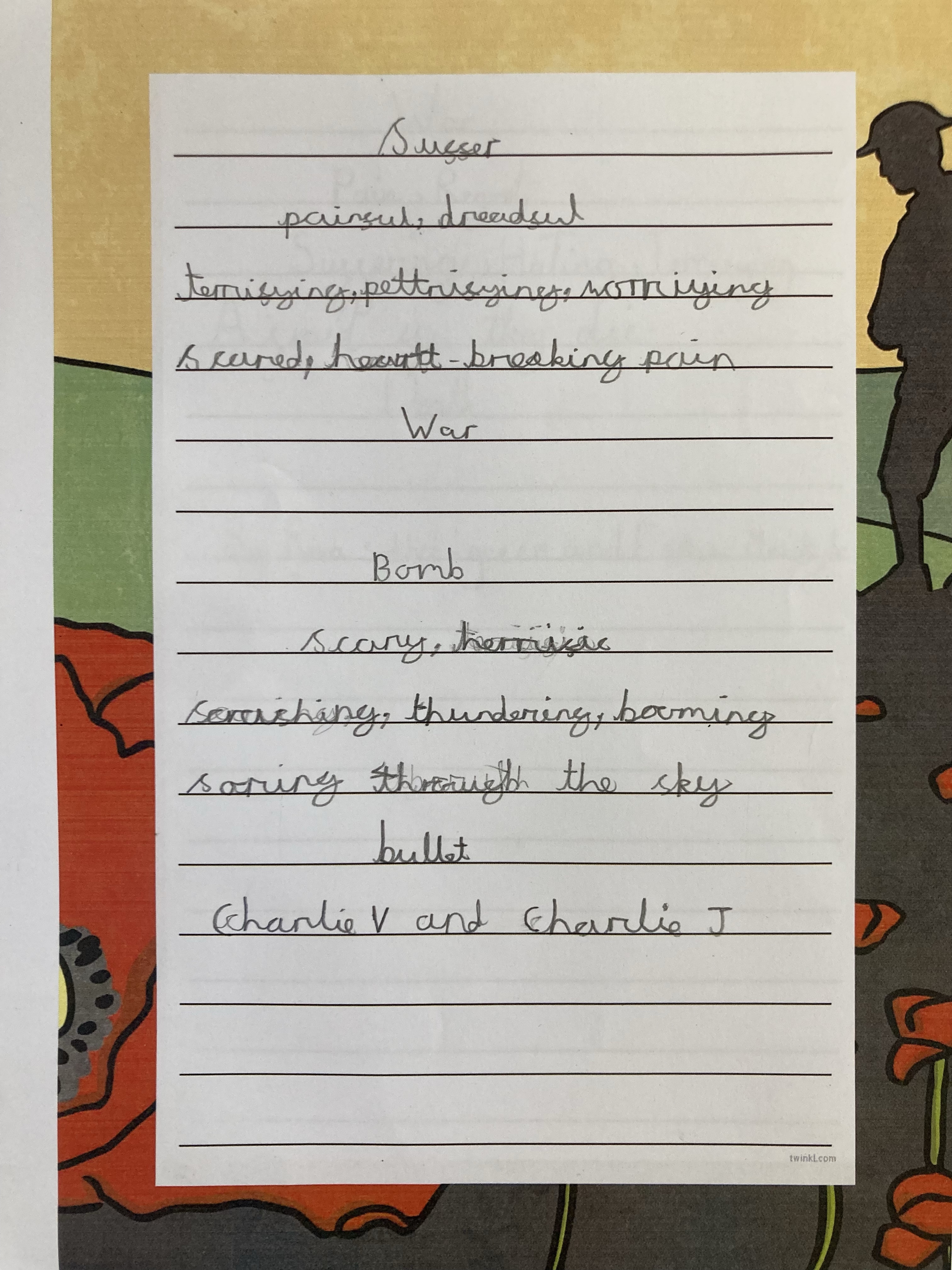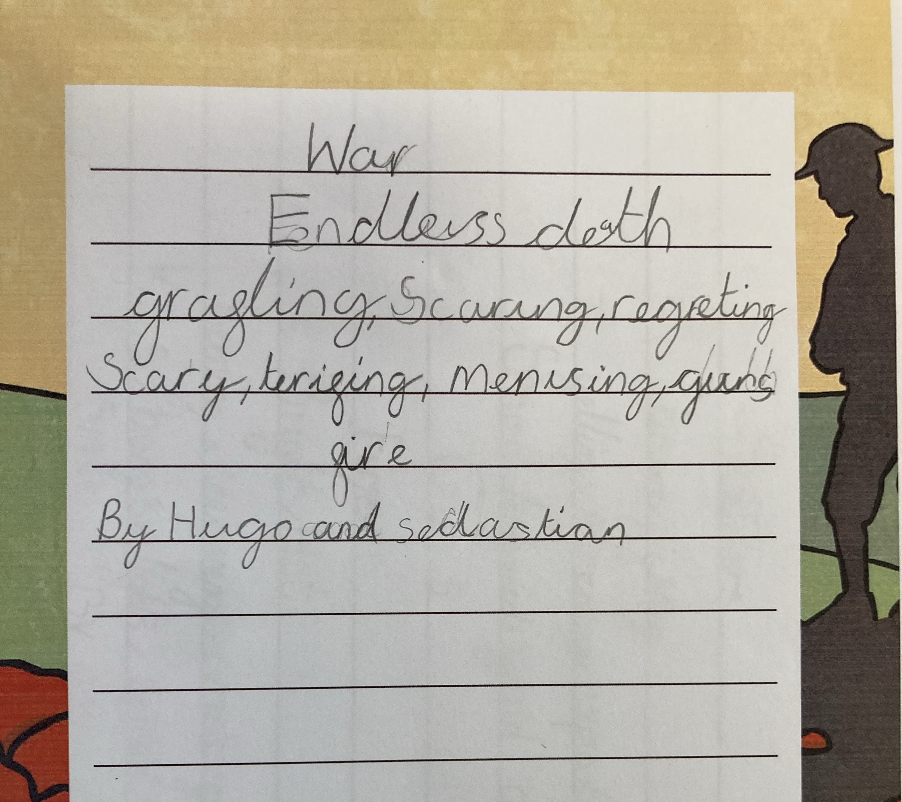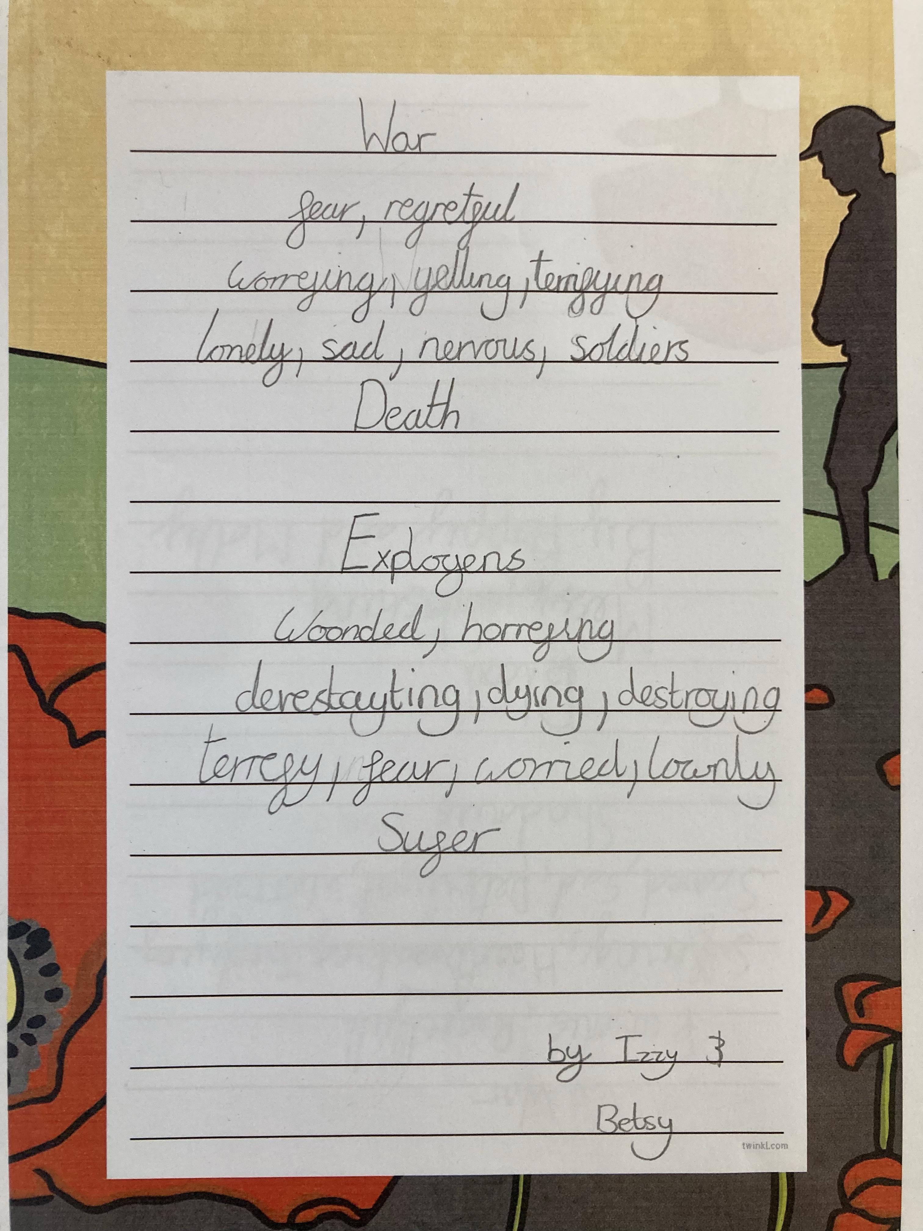 Next, we brainstormed what soldiers might see, hear , smell and feel. We used these ideas to create CINQUAIN poems. Our favourites will be shared during the Remembrance Service on Thursday.