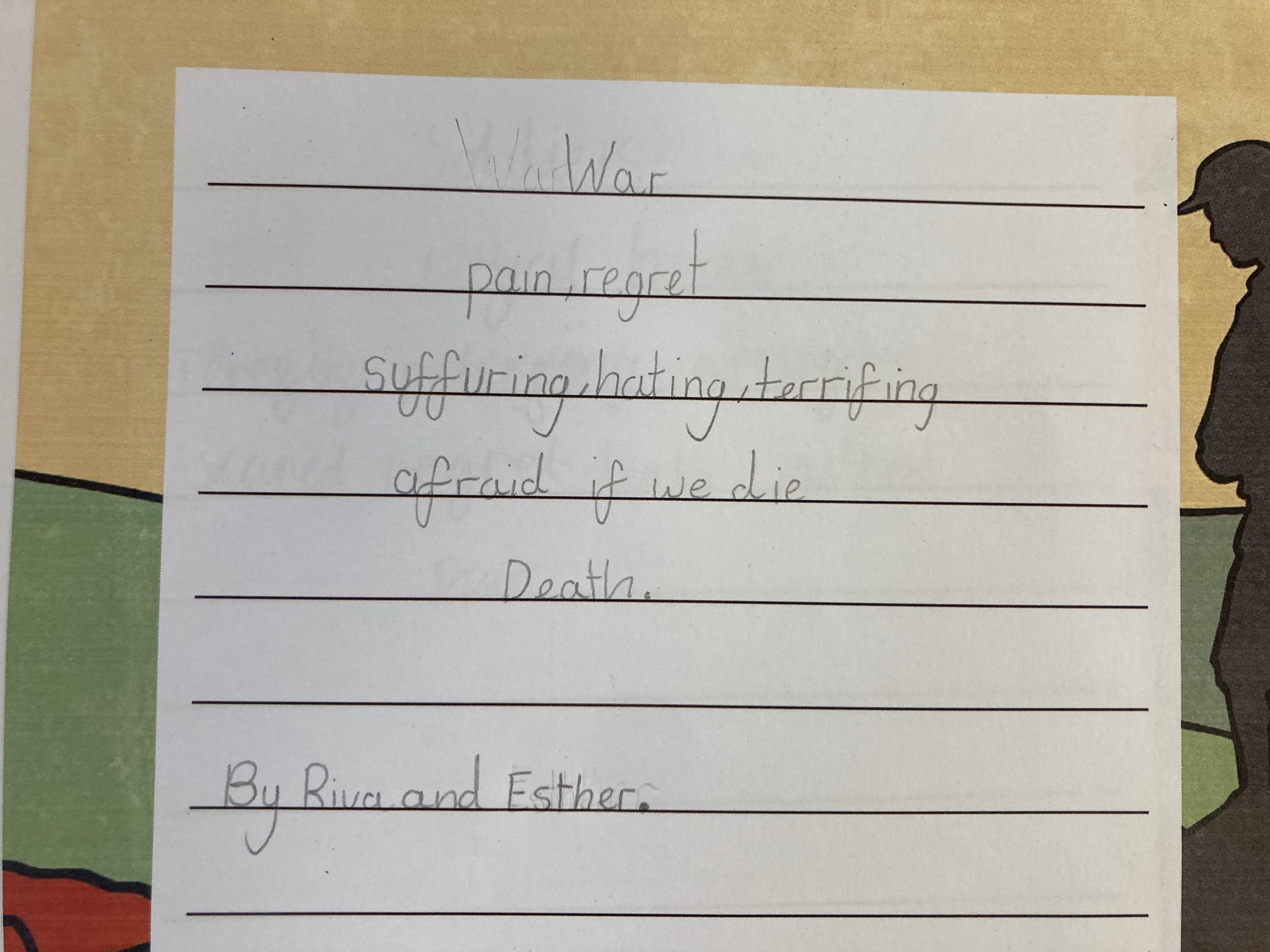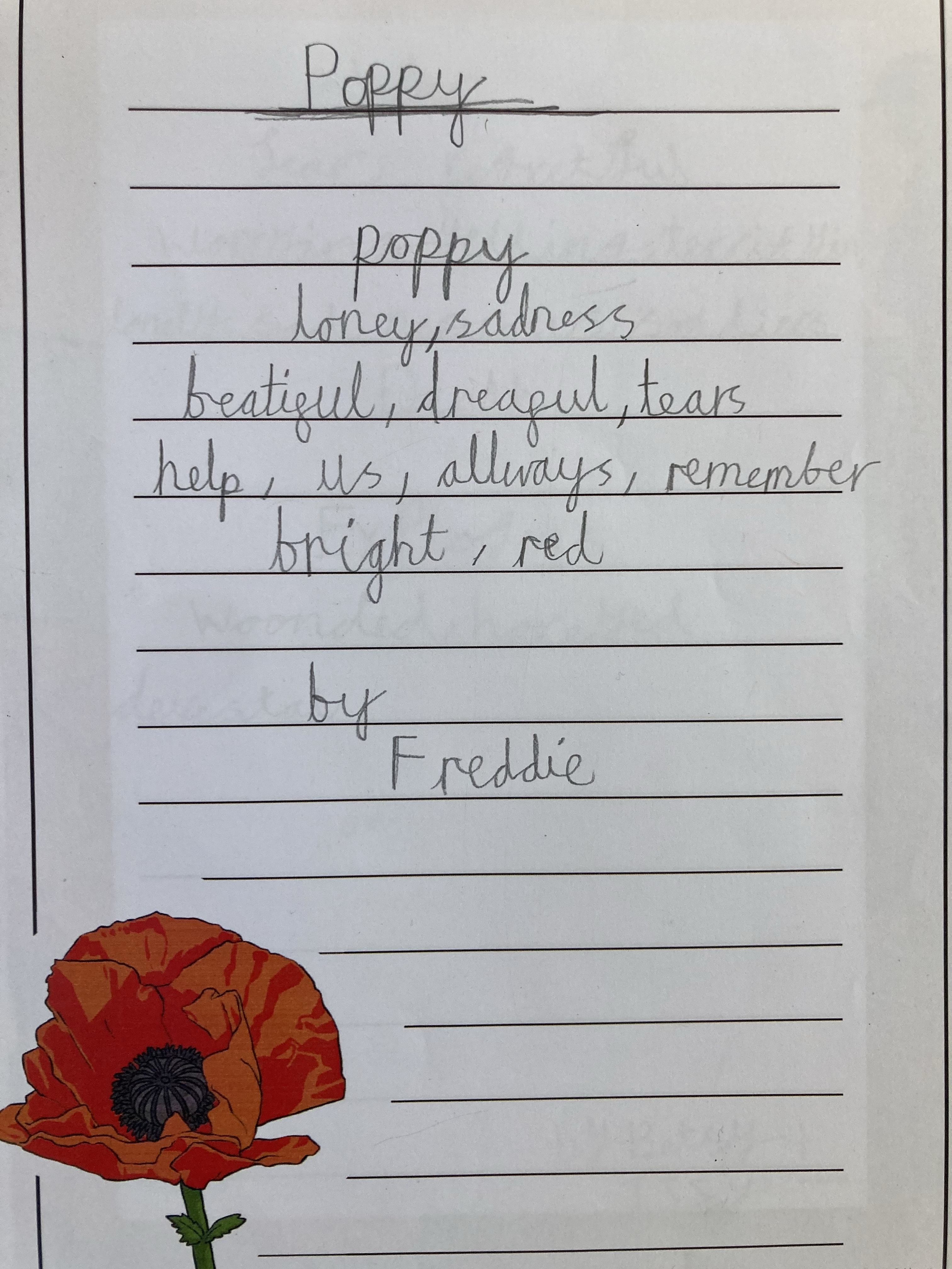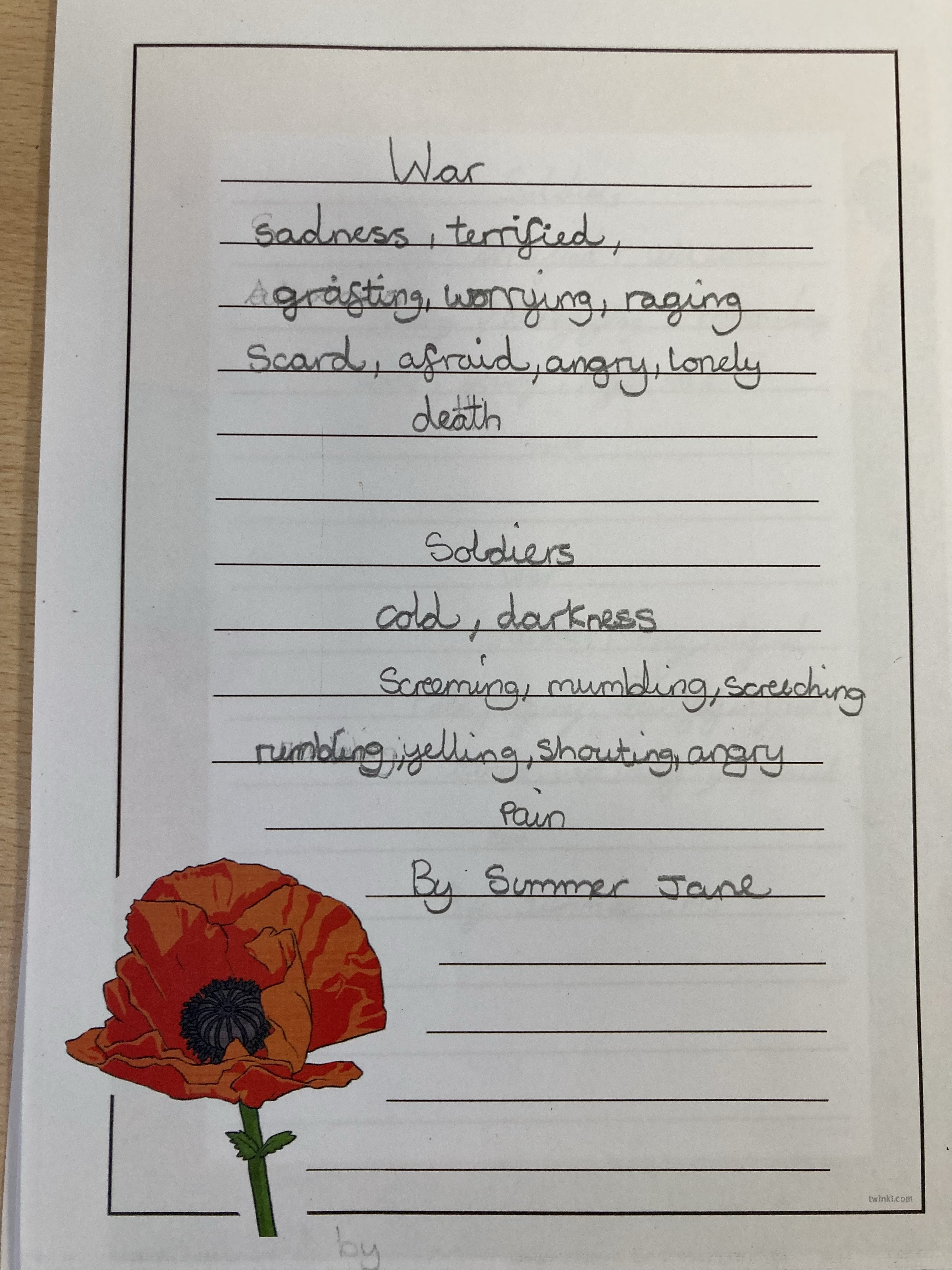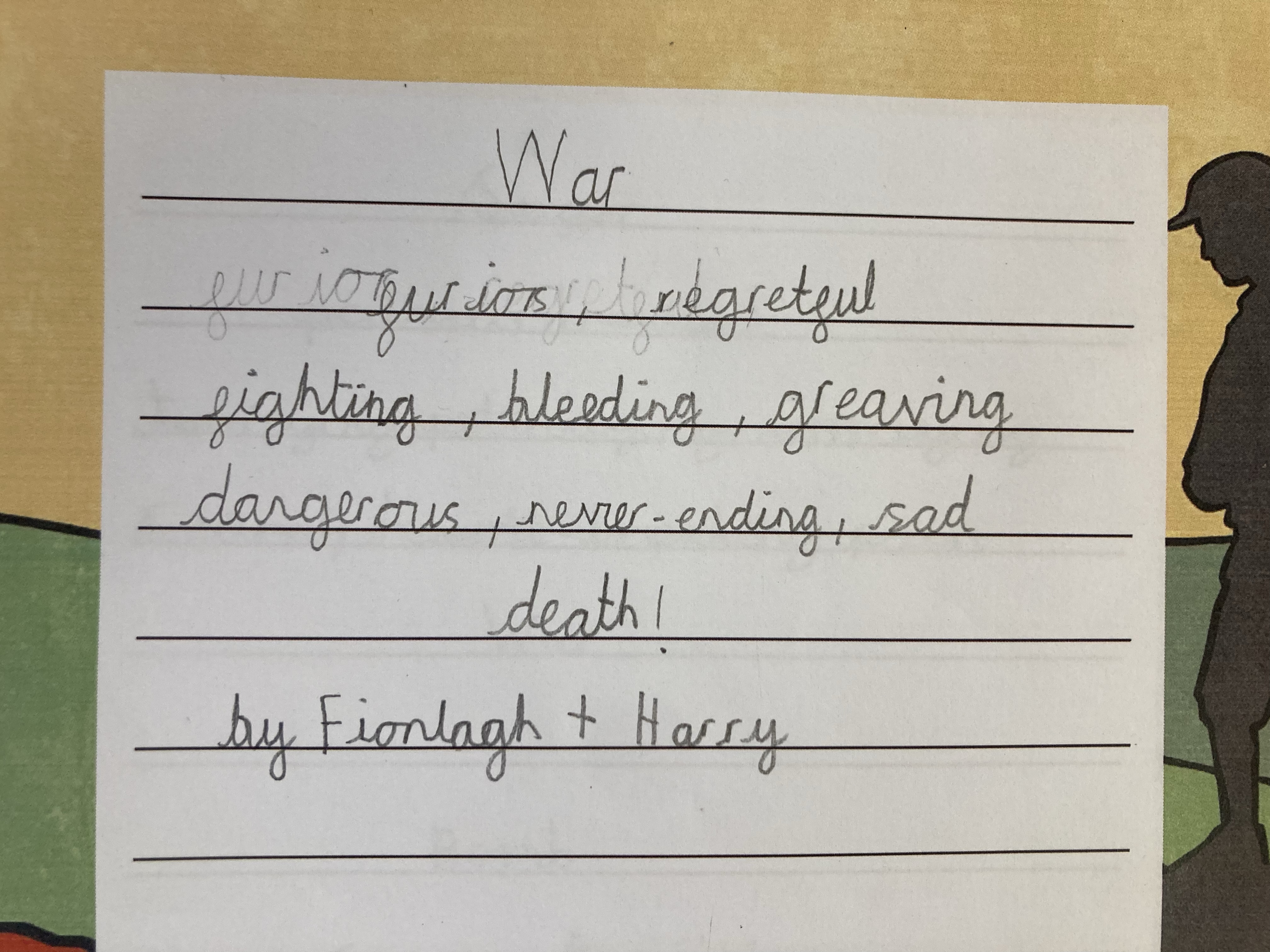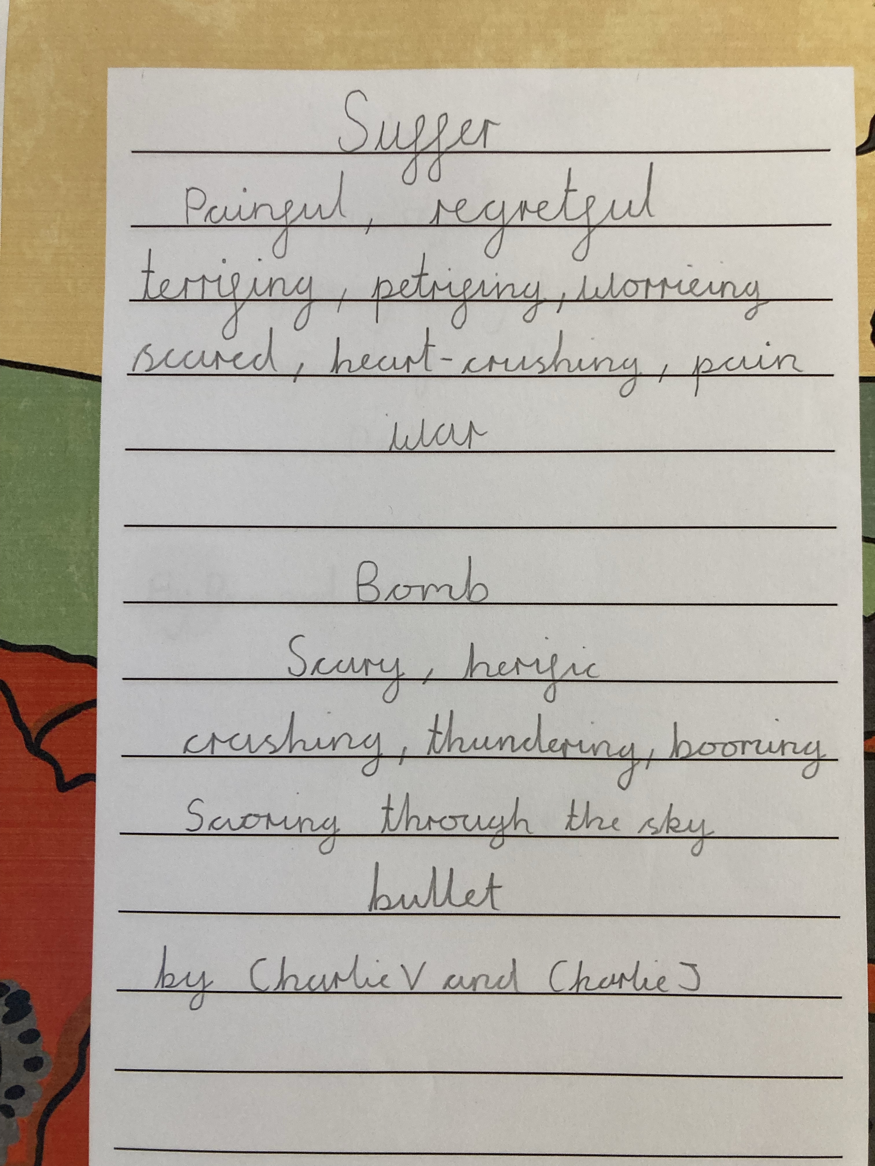 Next, we brainstormed what soldiers might see, hear , smell and feel. We used these ideas to create CINQUAIN poems. Our favourites will be shared during the Remembrance Service on Thursday.